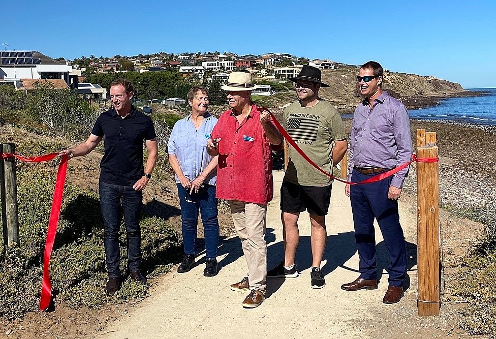 Image: Mayor of Marion Kris Hanna, centre, officially opens the new Field River section of the Coastal Walkway with the State Member for Black David Speirs, left, and City of Marion Councillors Maggie Duncan, Matthew Shilling and Ian Crossland.