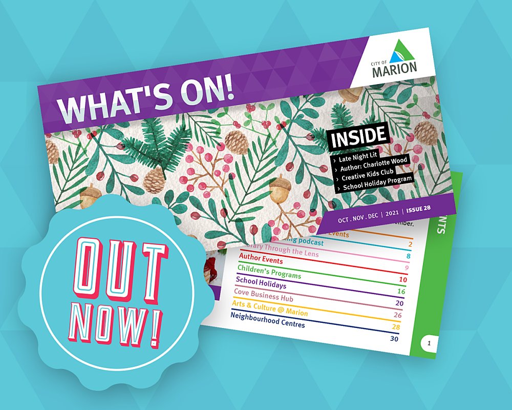 Find out about the latest in adult programs, author events, kids' holiday workshops, business seminars, arts presentations and much, much more throughout the months of October, November and December! Drop in to any branch of the Marion Libraries or Neighbourhood Centres and grab the latest What's On! booklet to see everything on offer or read it online below.