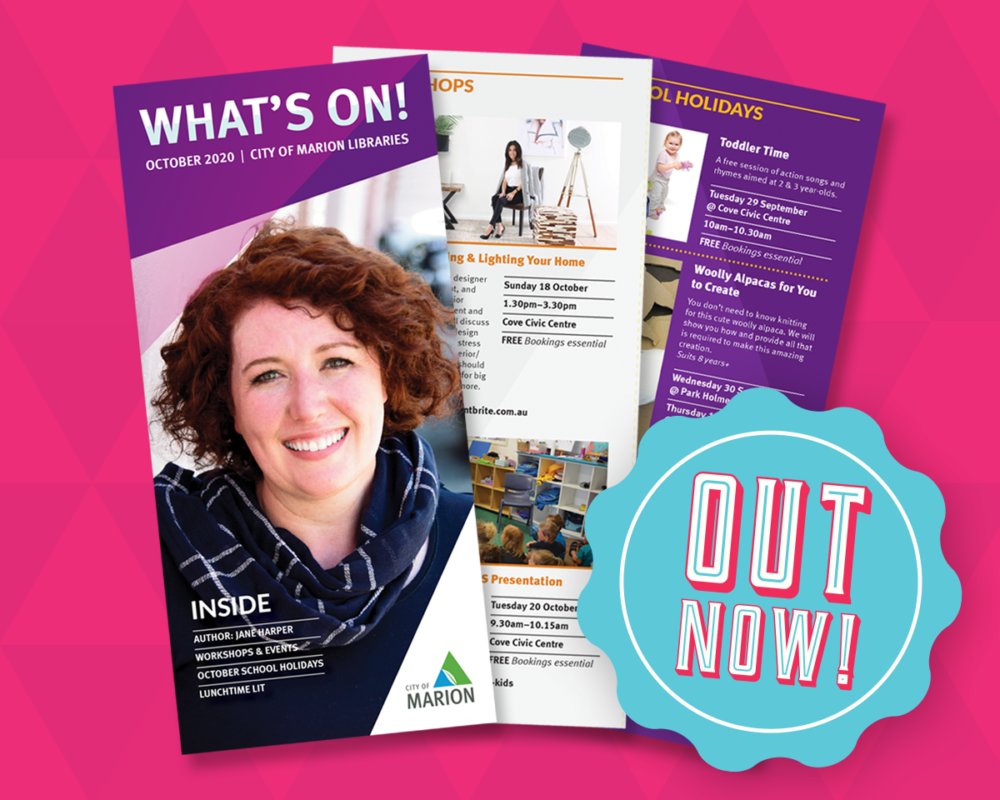 Next time you visit Marion Libraries be sure to grab one of the new 'What's On' booklets with all the information you will need about upcoming programs and activities. This is your 'one stop shop' with everything from school holiday programs to activities for families and fabulous author events during October!
