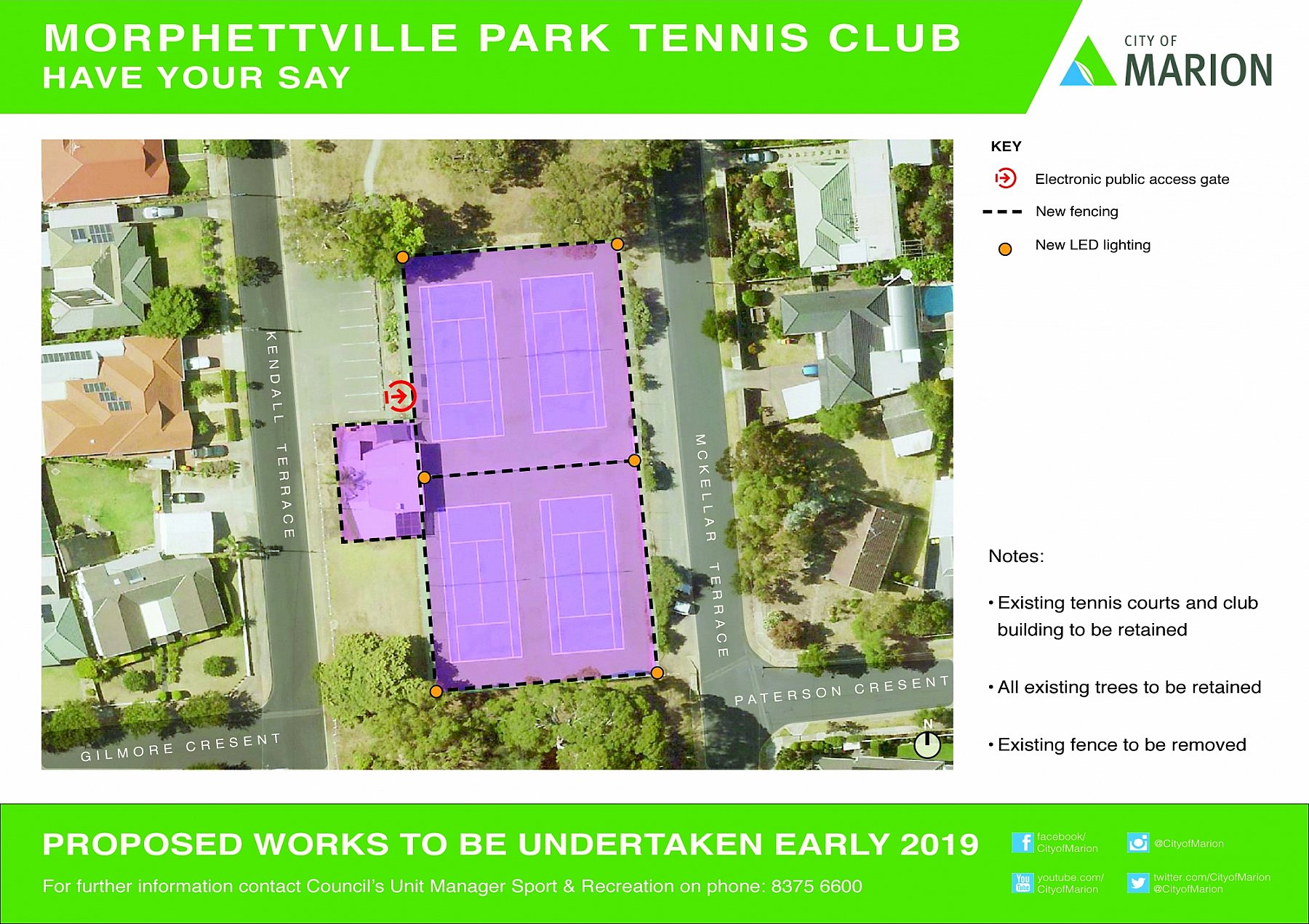 Works will commence early 2019 to upgrade the Morphettville Park Tennis Club courts at McKellar Terrace Reserve with new fencing and LED lighting.