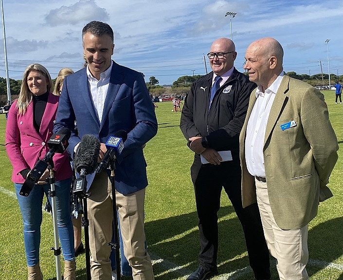 Photo: Premier of South Australia, Peter Malinauskas, left, with Cove FC President Dave Brain and the Mayor of Marion, Kris Hanna. Member for Davenport Erin Thompson is pictured right, in the background.