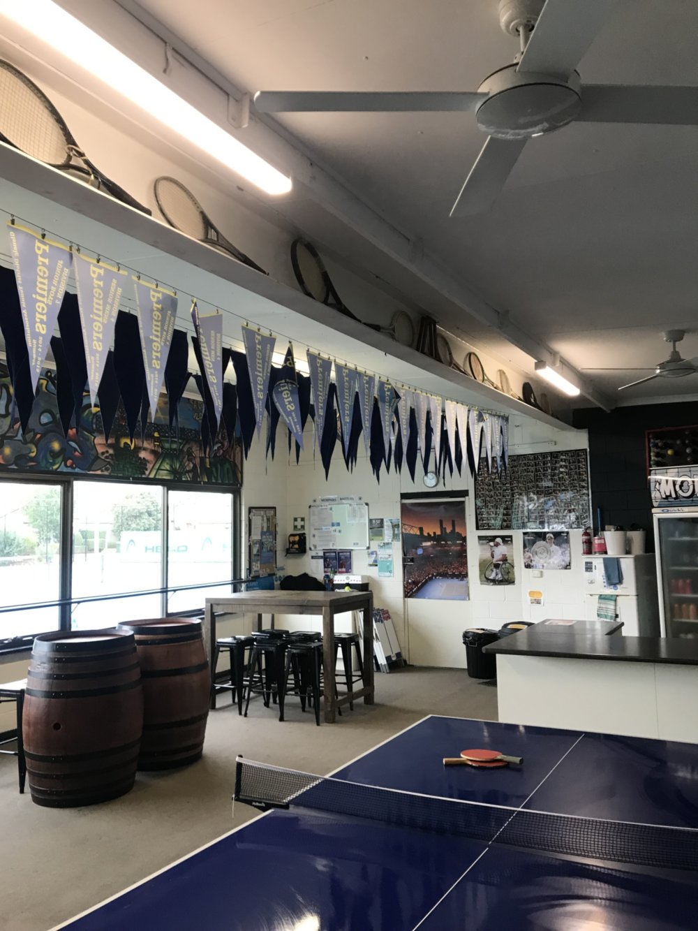 The Clubrooms consist of one open plan room with 2 x high tables and stools and 2 x wine barrels. The room also contains a table tennis table.