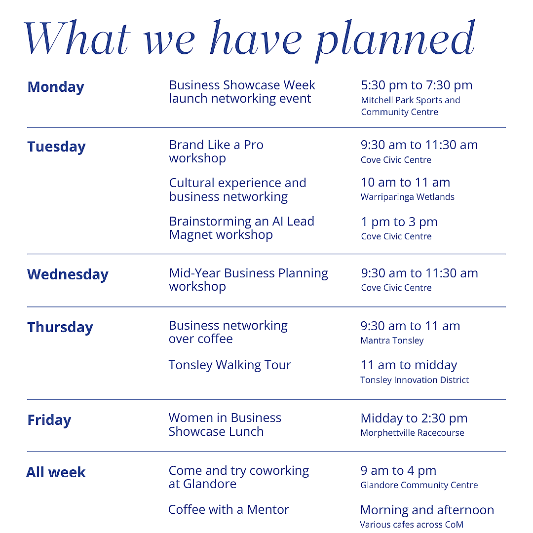Our Southern Business Mentoring Program mentors will be available for in person mentoring sessions at cafes across Marion throughout Business Showcase Week. The Southern Business Mentoring Program provdies residents and businesses within the City of Marion with complimentary mentoring sessions with eleven advisors.