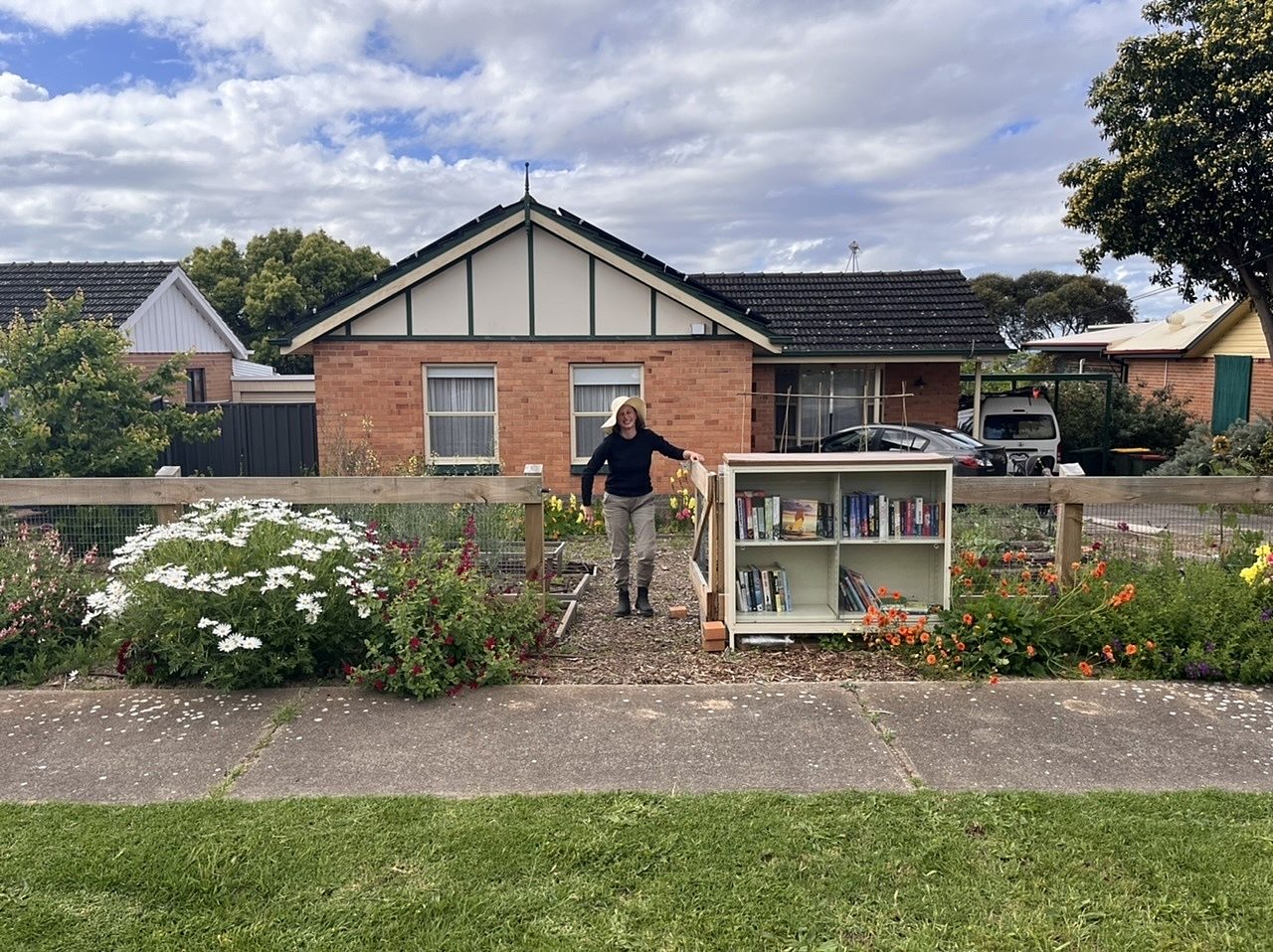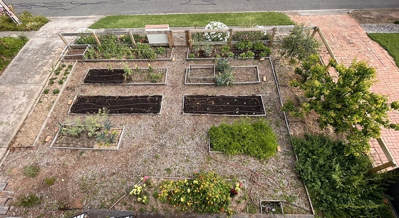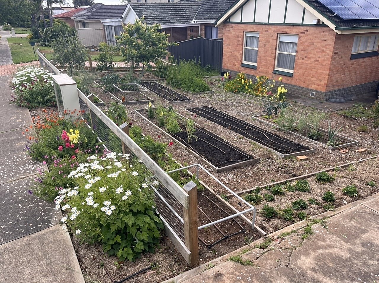 Originally a bare grass lawn, we have converted it into an edible garden. We are endeavouring to be as organic as possible and apply the permaculture principles as best we can. We have also set up a community library and give away our excess produce to our neighbours. We aim to grow our own vegetables to reduce our carbon footprint. We would like to learn how to grow food in a sustainable way that doesn’t negatively affect the environment. We also just love to garden and enjoy sharing the produce with our neighbours. We have an olive, lime and apricot tree. We have asparagus and strawberries. We have just planted capsicum, tomatoes, basil, chillies, eggplant, zucchini, lettuce, spinach, silver beet, kale, cucumber, green beans and loads of parsley. There are plenty of wild poppies and nasturtium as well as a variety of perennial flowers to attract bees. We are also planting soybeans to replenish the nitrogen in the soil. There is also a small area for native bushes to help with native bird life.