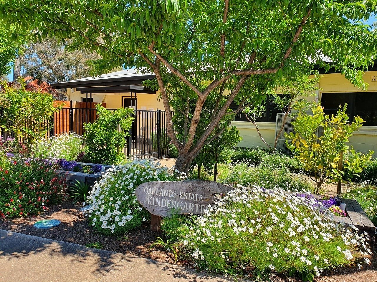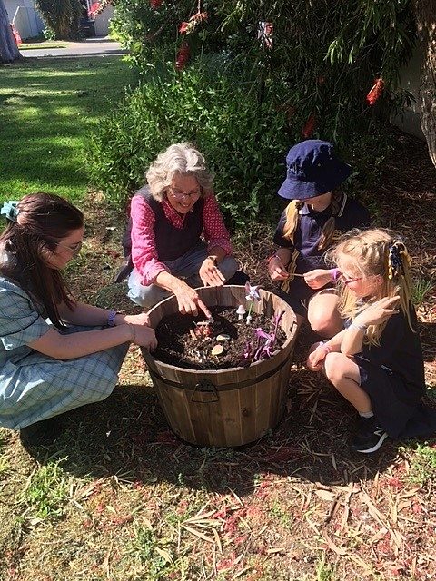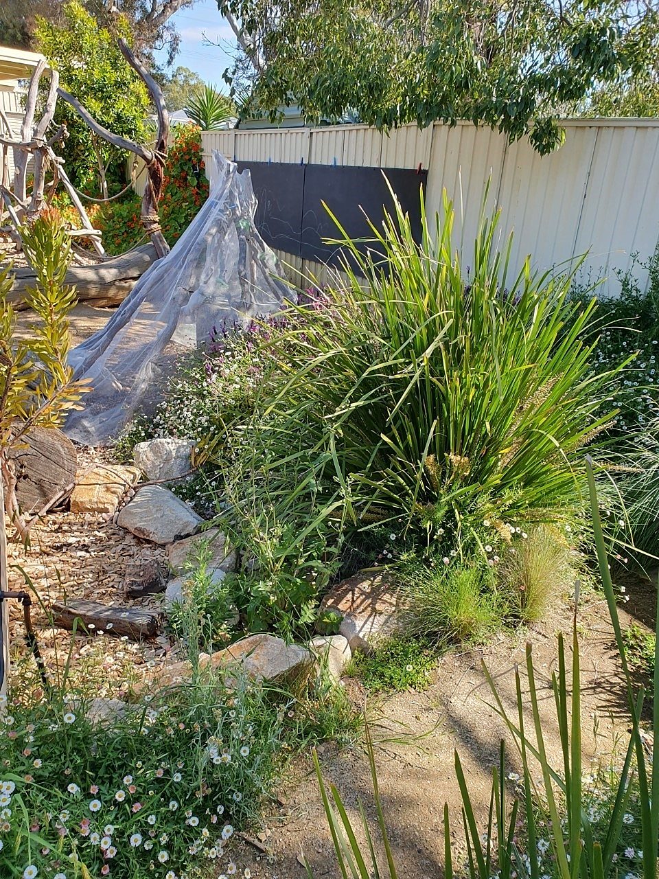 Planted specifically with young children and their families in mind, we have trees, shrubs and plants that shade, feed and entice children and their families to learn about the world around us. It is colourful, non-toxic and accessible. The garden was planned as a learning environment which allows children, families and the community to enjoy a safe and attractive space. We encourage passers-by as well as our families to pick fruit from the peach, lemon and mandarin trees in the front garden. From the trees we enjoy fig, peach, lily-pilly and mulberry crops each year. Children plant seasonal crops and watch, measure then harvest them. We make lily-pilly jam on the fire-pit or pick celeriac, mint, parsley or lavender to share with families. The vegetable patch at the moment has tomatoes, strawberries, snow peas and cucumbers. Children learn about colour and size as a gauge for when to harvest. The produce unites the children from planting the seeds/seedlings, watering and caring for them, picking them, to eating them as part of our nutrition program of 'eating the rainbow'. The garden is also a habitat for our blue tongue lizard family, geckos and other small lizards. birds, insects and arachnids. Bringing people together, the garden provides a venue to host visitors to enjoy the space and children to share their pleasure in nature play learning. Regular family days allow children to showcase their learning about the garden and share favourite areas including the fig tree (aka the climbing tree), the butterfly garden, the nasturtium forest, the mud pit, the mud kitchen and the rolling hill to name a few. The butterfly garden was developed in 2019 when children noticed a corner that was empty and discussed it with the educators. The Governing Council (elected from the parents of the preschool) endorsed an application for a grant and the funds were spent on native and sensory rich plants. Each child, with help from their parent, chose a plant, dug it in and monitored its progress until successfully established. Now thriving, it is a space for children's play as well as a habitat for lizards, bees, butterflies, and a range of smaller insects which in turn attracts possums (berries), birds and bats (insects and berries).