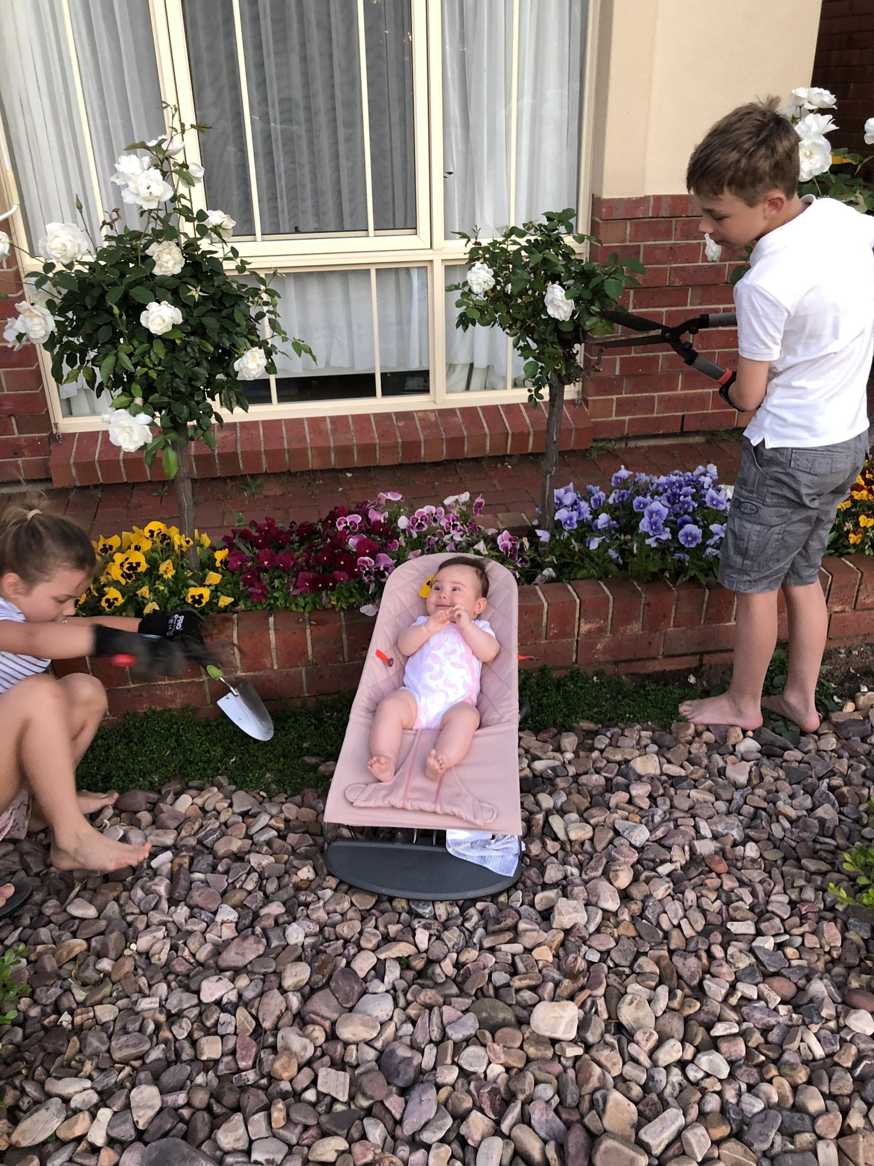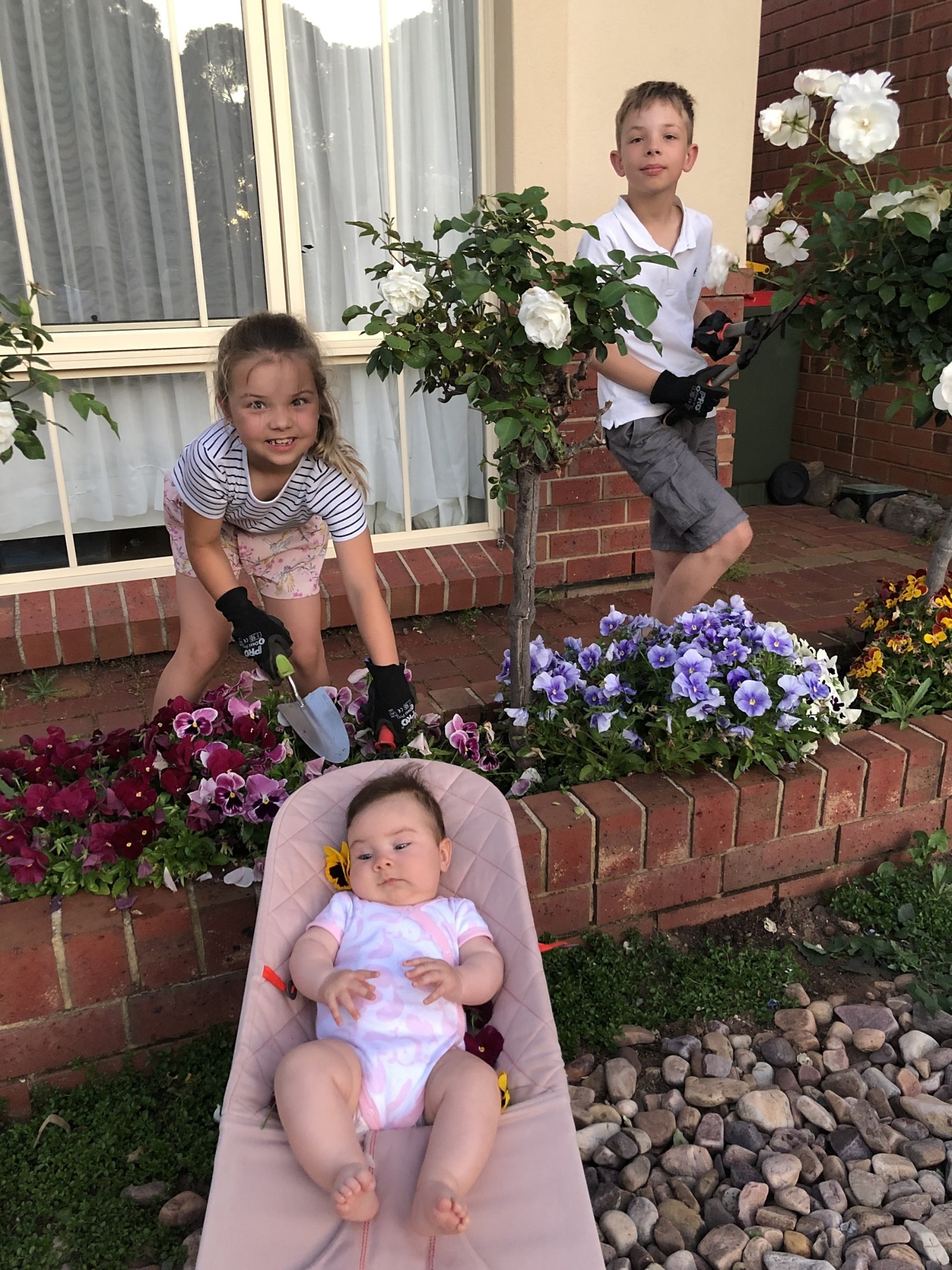 My children love to help with pulling out the weeds and cutting dead branches of our roses. A little sister enjoys being outside with siblings and watching them doing gardening. They love to water our flowers. They fill up the water from rainwater tank in watering can and water them by themself. They enjoy colourful flowers in our front yard. Before school they smell the roses, which are growing in the front yard. They can recognise weeds and with the enthusiasm they pull them out to make space for the flowers to grow.