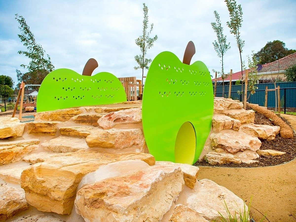 Climb up the rope A-frame and swing with your friends on the 5-way swinger under a shady sail at Harbrow Grove Reserve. Junior BMXers will love navigating the small bike circuit under the trees, including wall turns, a tilt beam and an Indian bridge balance. Featuring lots of public art, facilities and the Rocky River bridge, the park is a beautiful surrounding for your picnic.