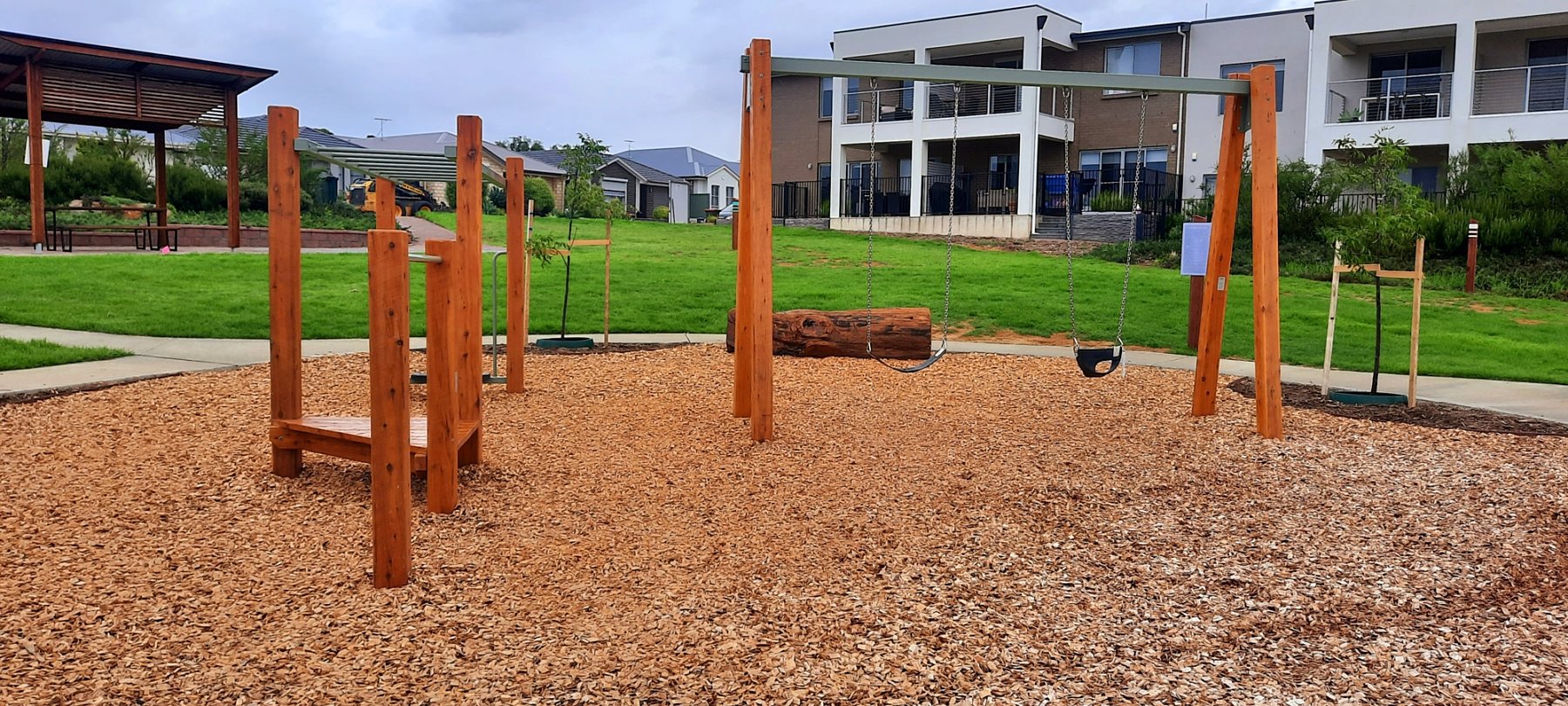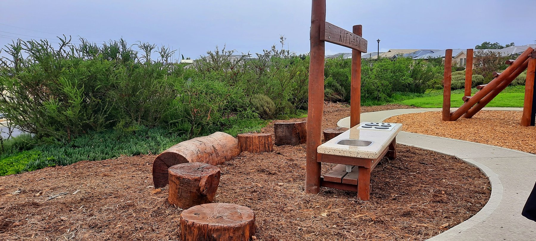 More traditional play elements include a standard and baby swing and junior scooter/bike track looping around the perimeter of the reserve. Additional amenities include a drinking fountain, bench seating, and nature play balance logs. This playground is a welcome addition to a site that previously contained shade and a picnic table. New plants were added in April 2021 to enhance the look and feel of the reserve.