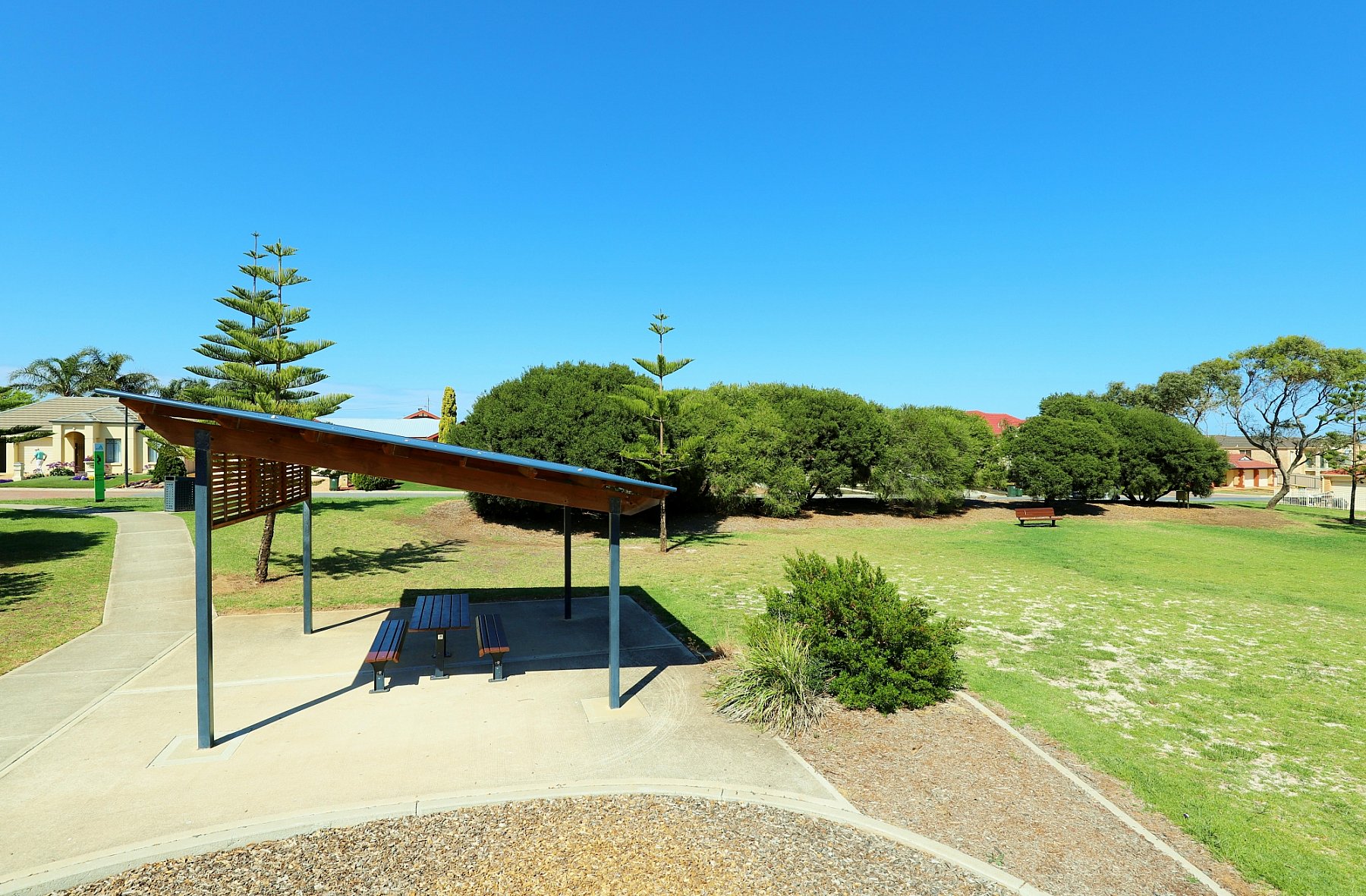 A sheltered picnic table is located next to the playground and a bench seat overlooks the grassy kick about area.