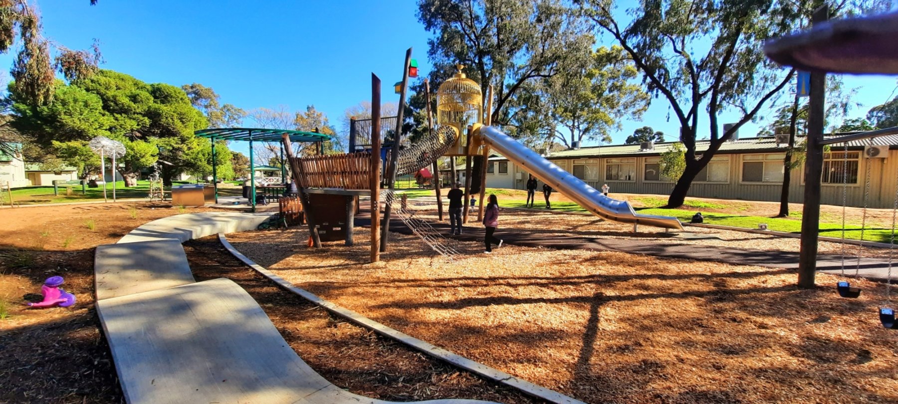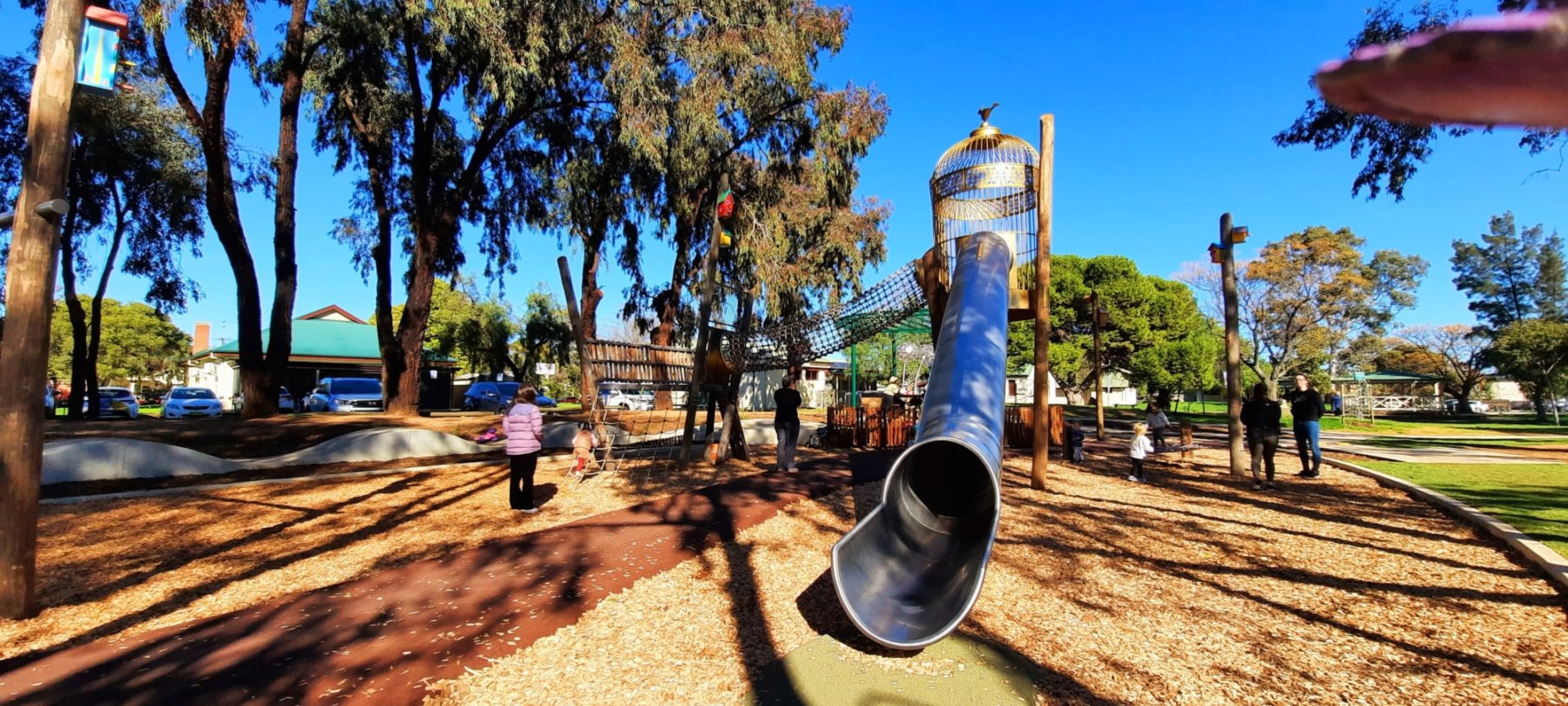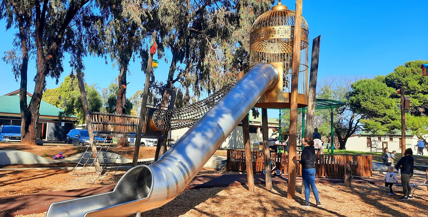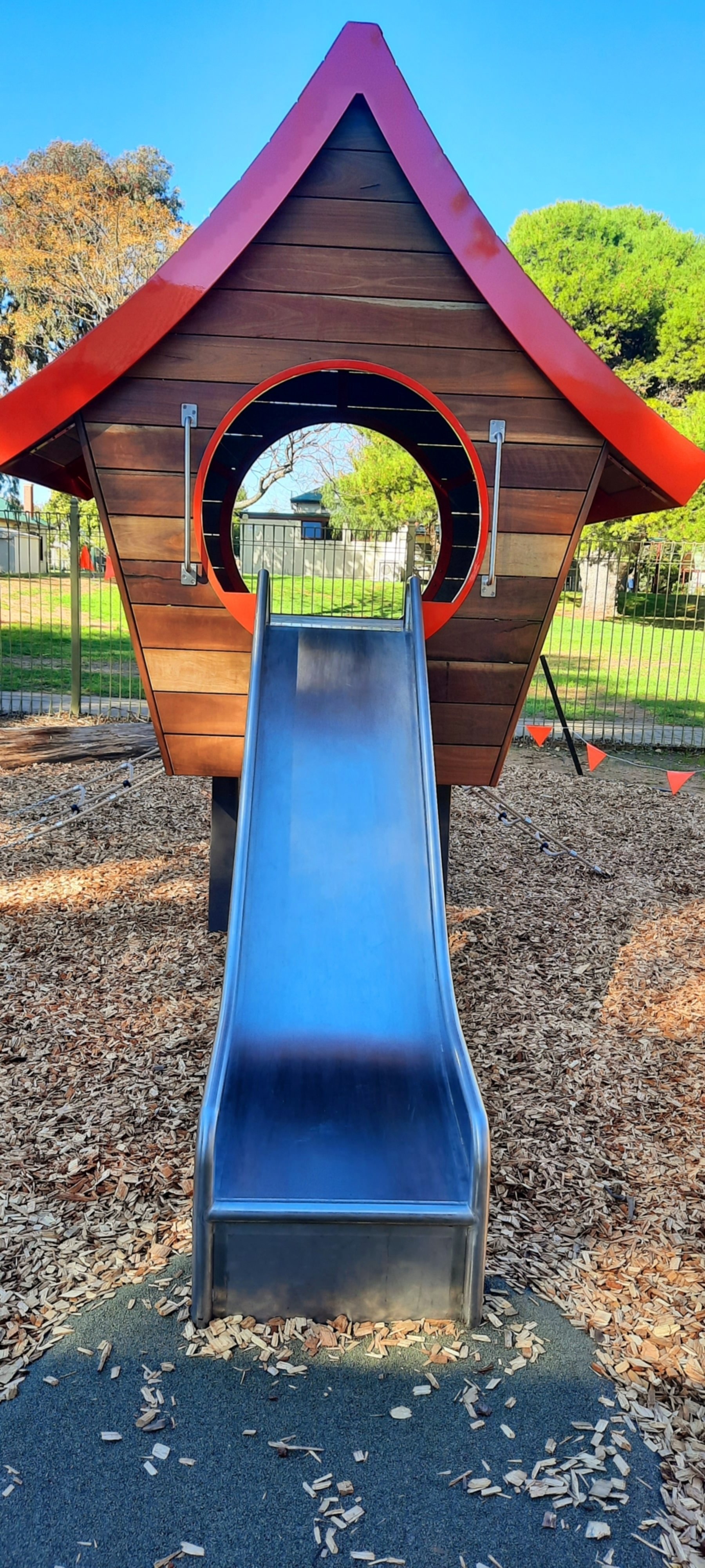 This upgraded reserve features a birdcage design with a scramble net, tunnel slide and climbing logs which opened in July 2021. Junior play echoes this theme with a birdhouse inspired structure, scramble net and junior slide.