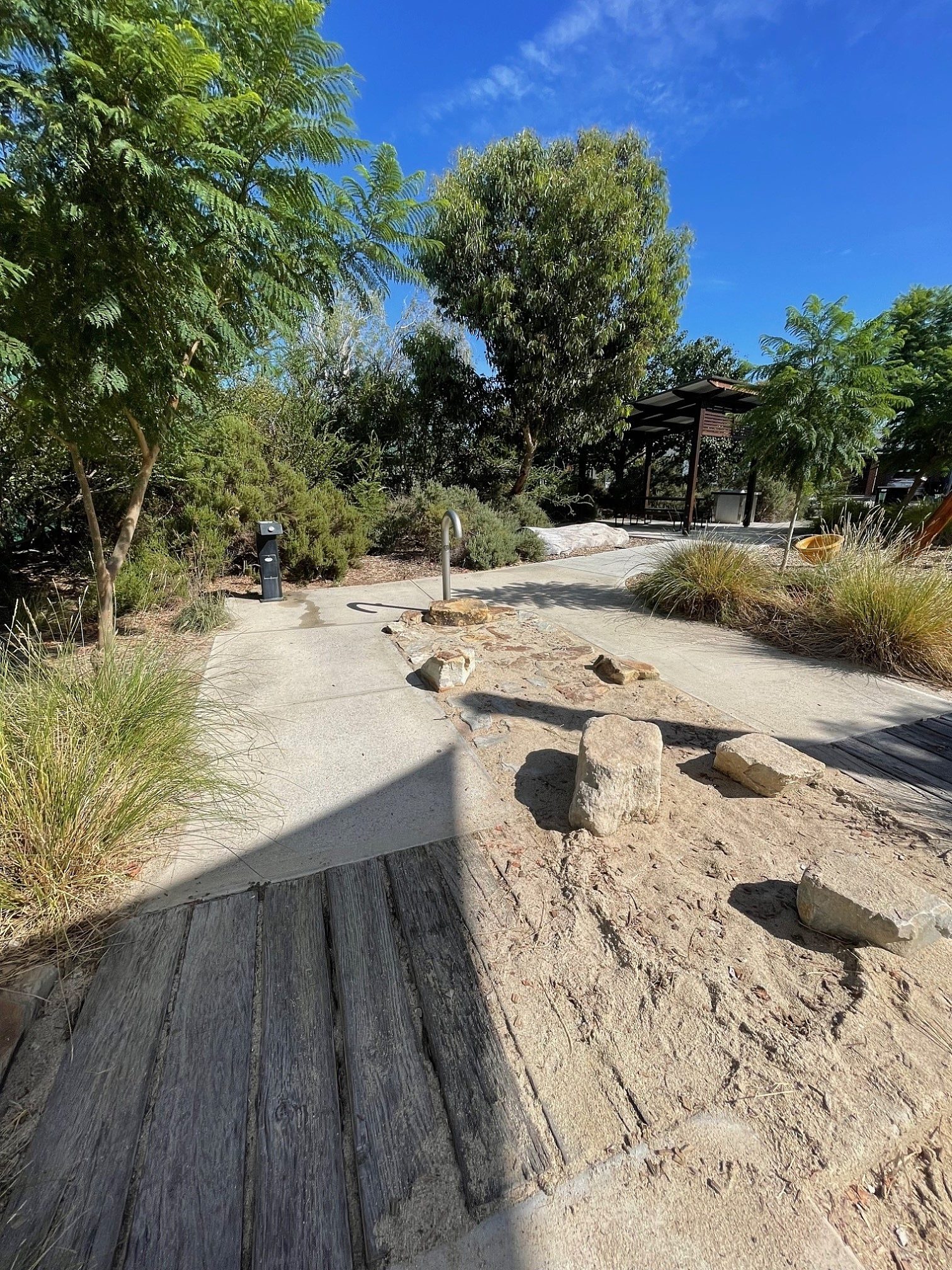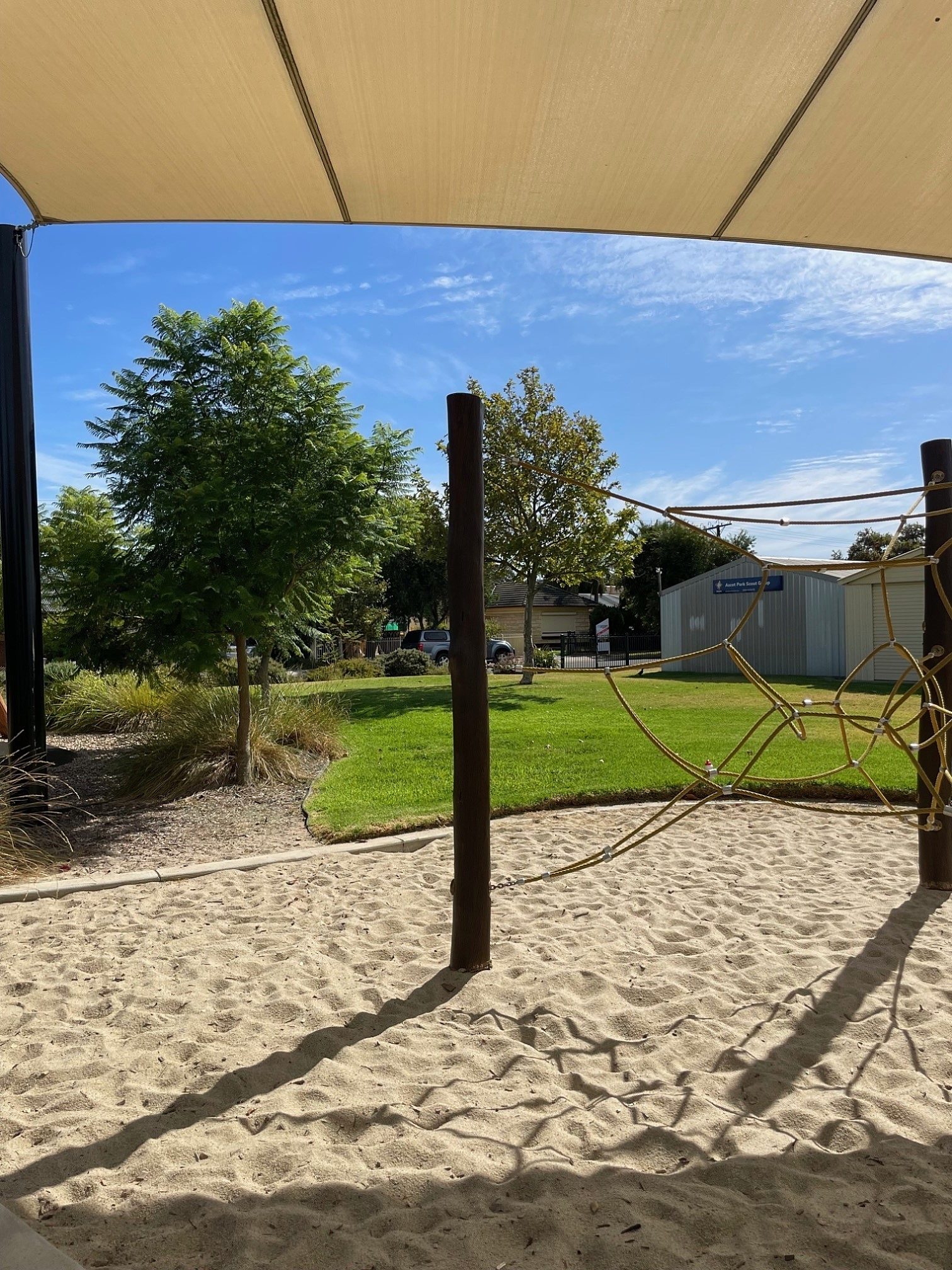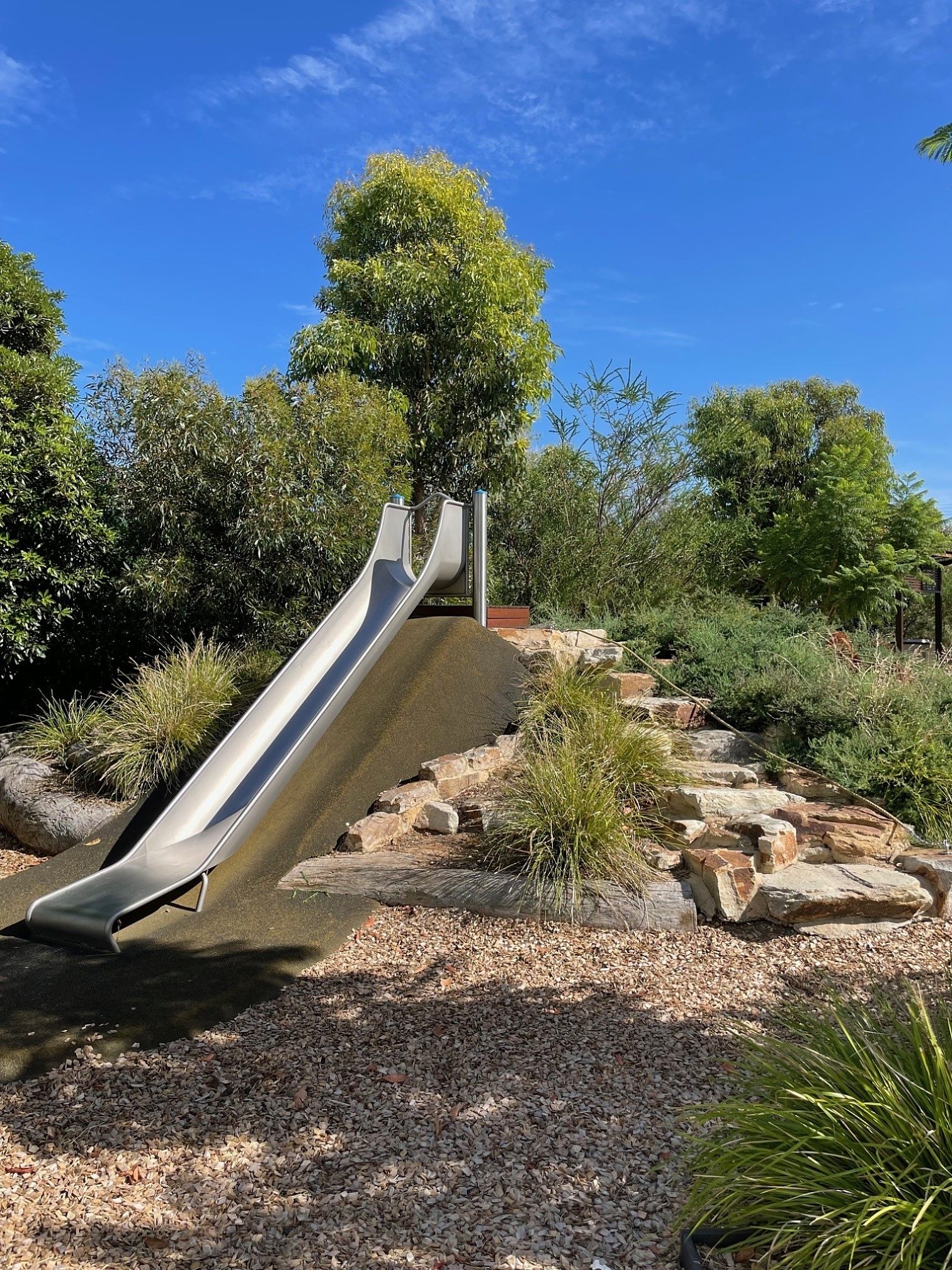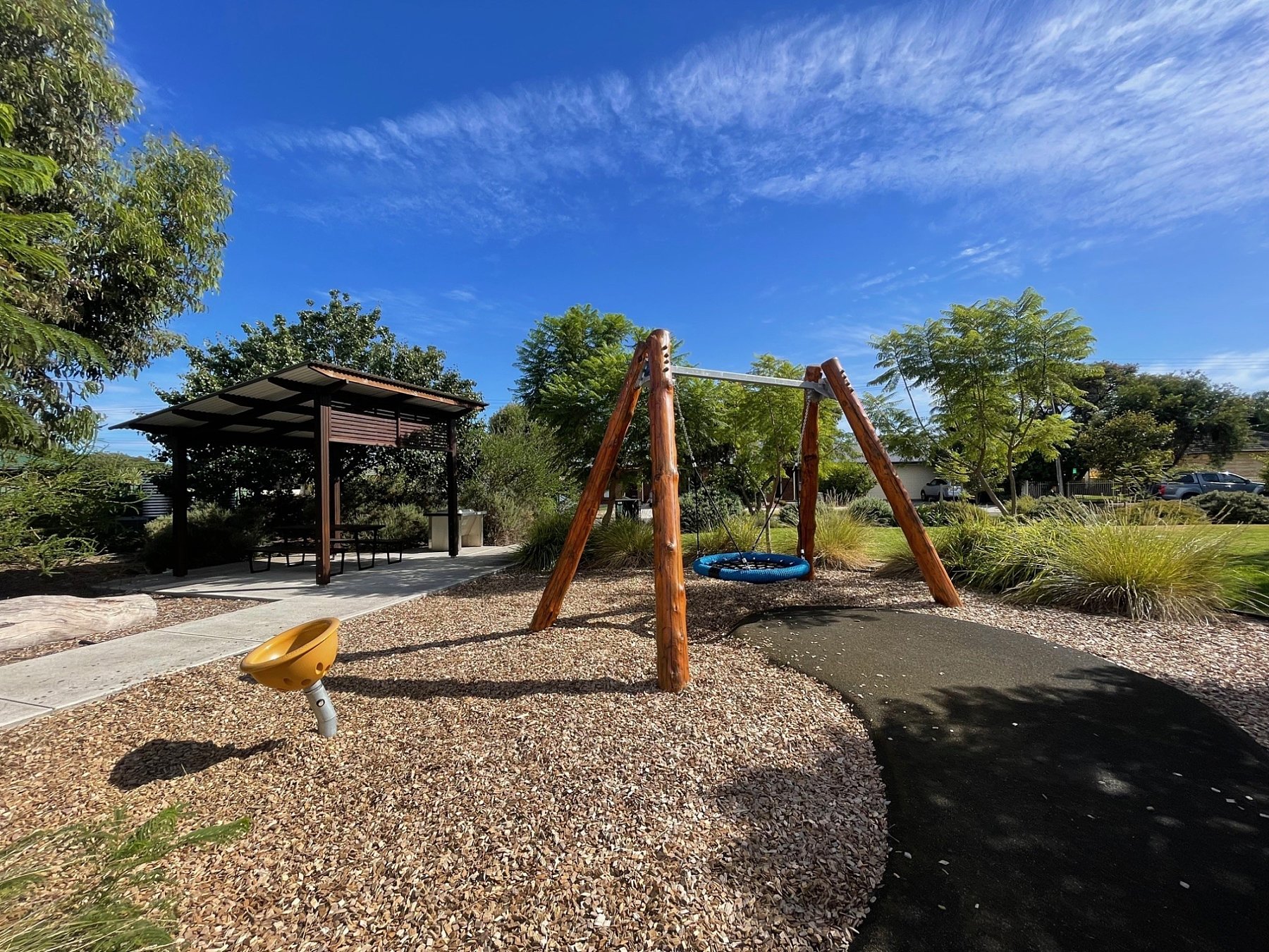 The playground features a large undercover climbing net in a sandpit which is linked to a rocky water play area. Choose to climb the rocks or the logs to take a ride down the mound slide. Take a swing in the basket swing or twirl around in the spinning cup. A small kickabout area is also a lovely place to have a picnic and the reserve has logs and rocks to climb on.