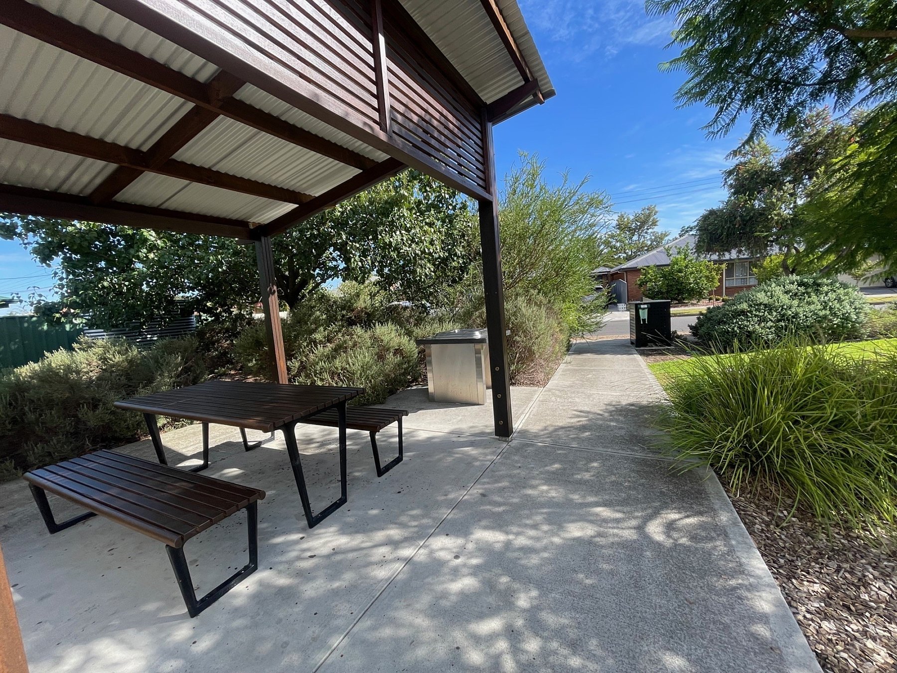 There is a picnic table, a BBQ, seating and a drinking fountain. A number of trees have been planted that will provide further shade in the future.