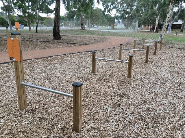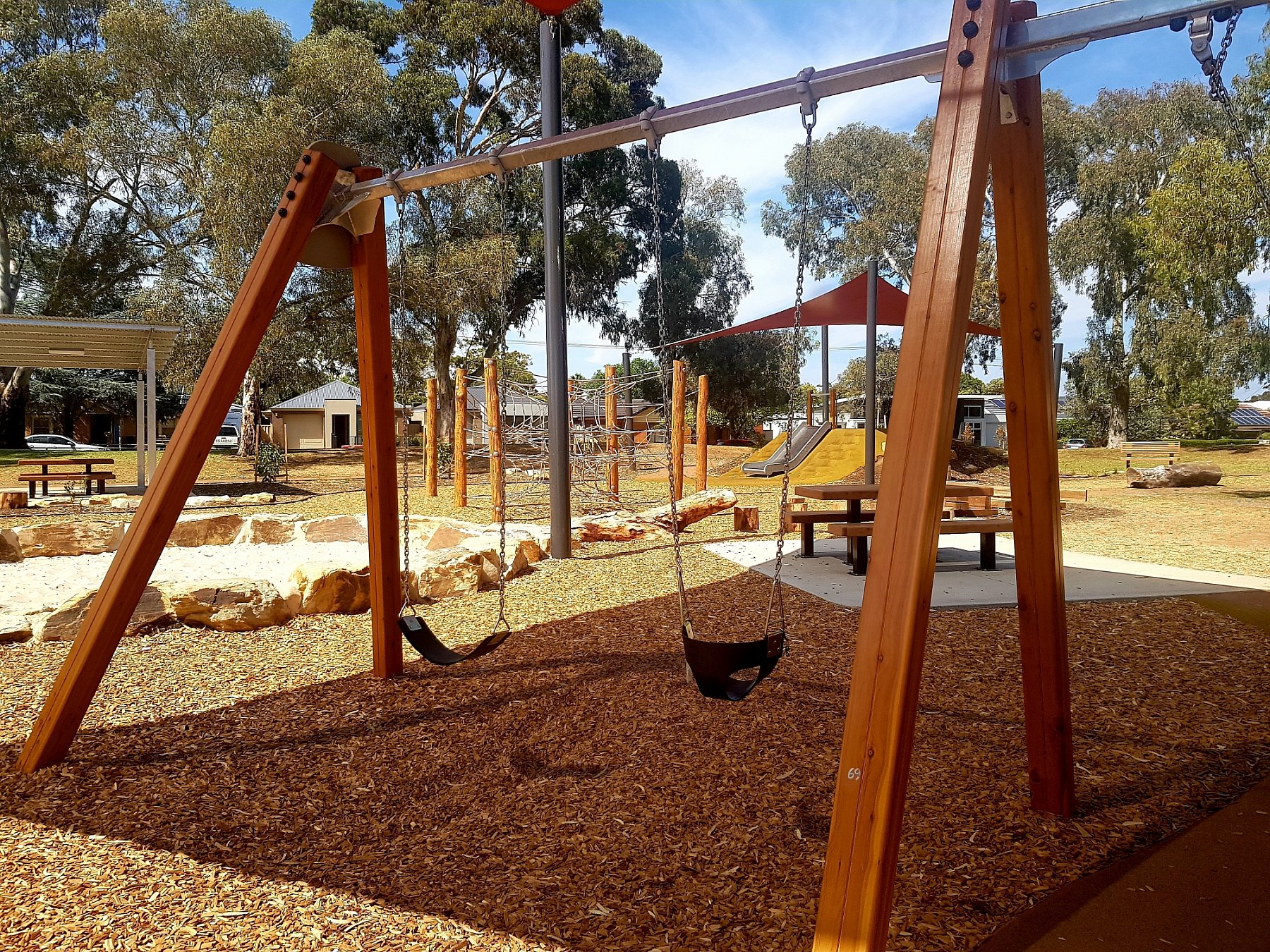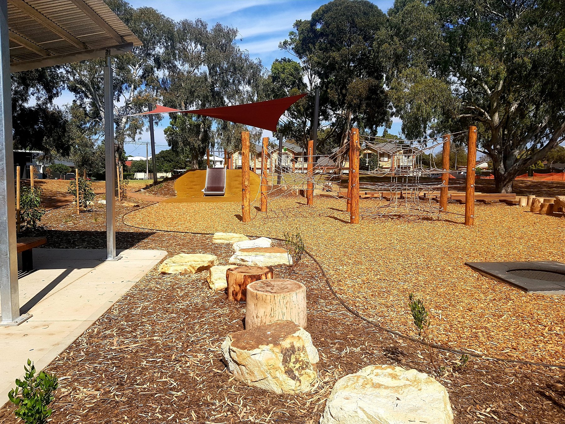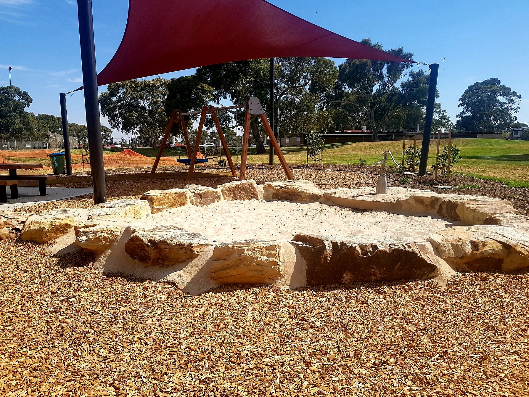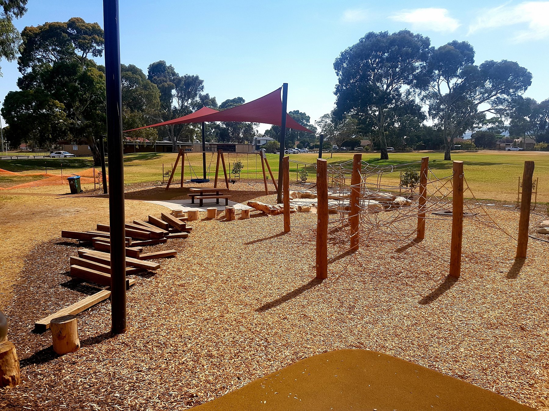 Mitchell Park Oval Playground includes timber climbing frames, a trampoline, slide, sand and water play area, a maze and steppers. There is a picnic shelter with a barbeque, drinking fountain, walking paths, landscaping and irrigation.