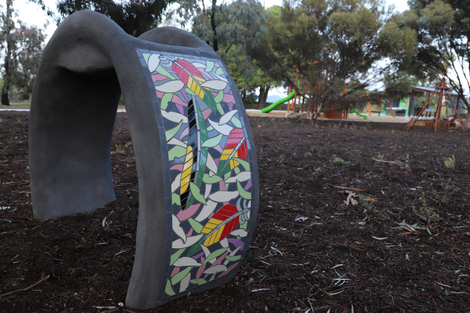 This reserve officially opened in June 2021. Artworks include a timber sculpture, mosaic birdbath and toilet mural, all depicting local birdlife. Featured birdlife includes the rainbow lorikeet and the yellow-tailed black cockatoo.