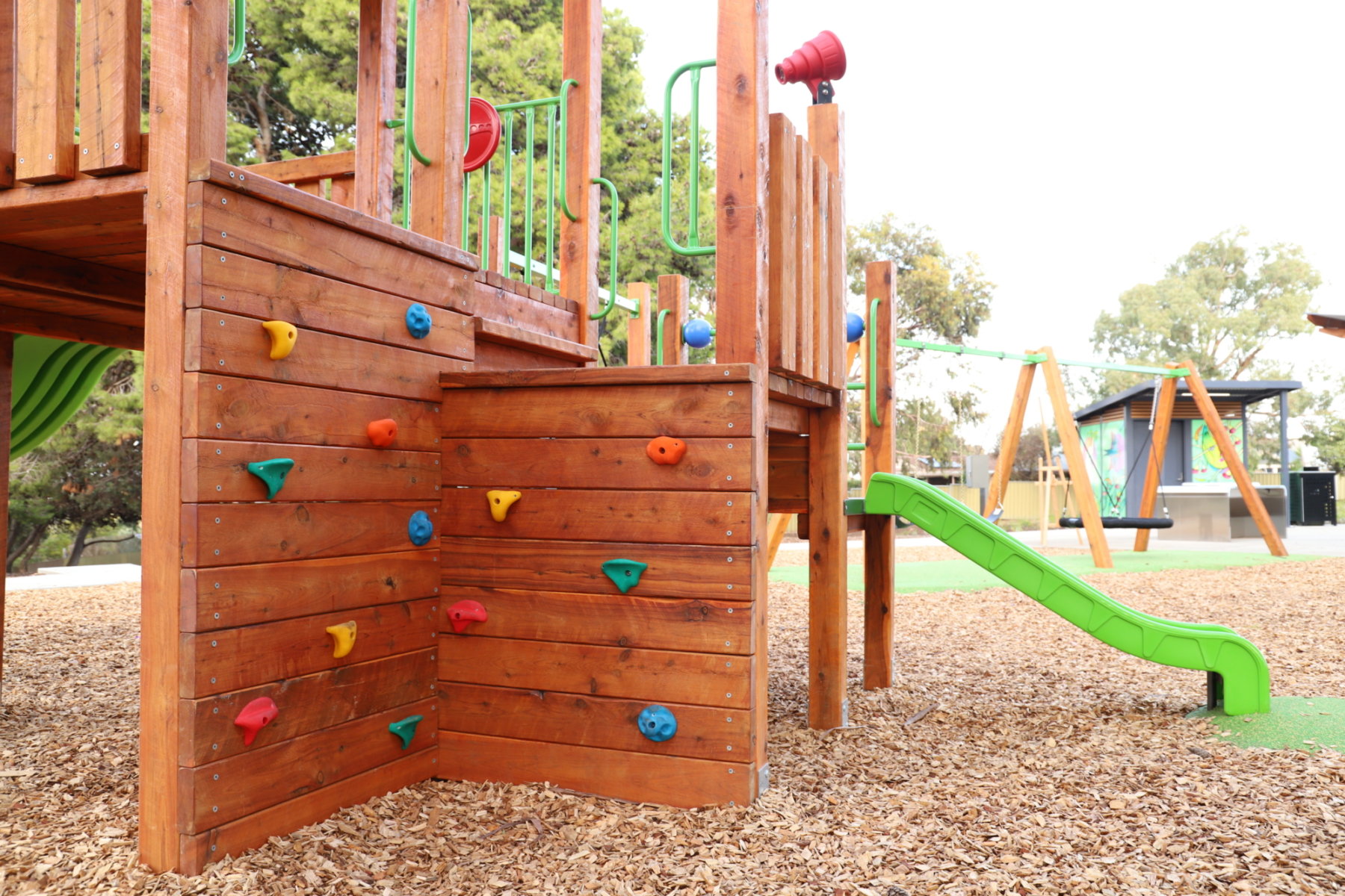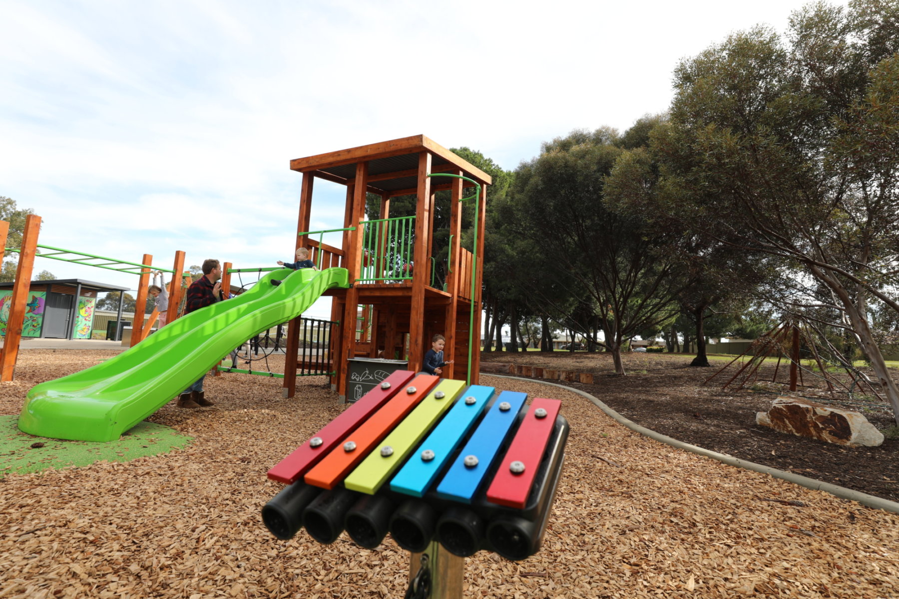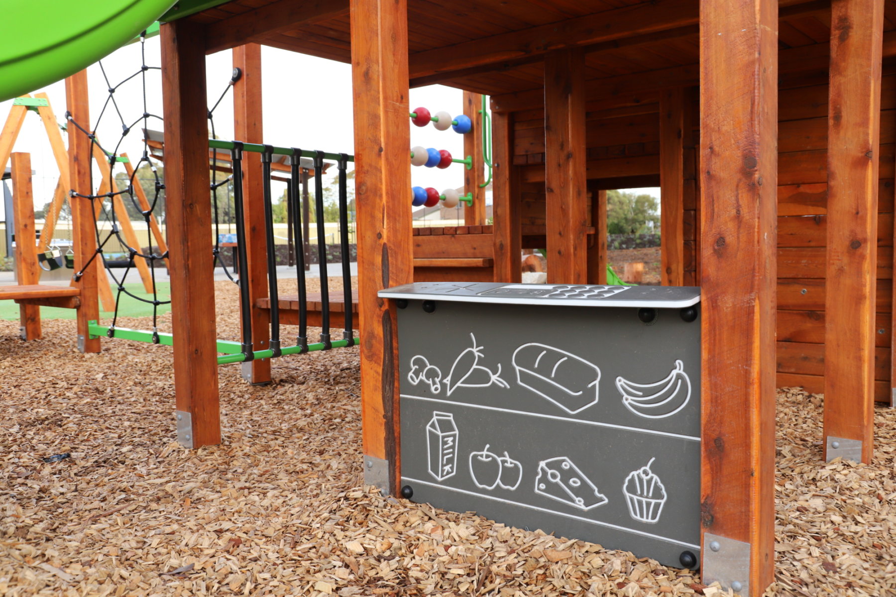 Additional upgrade features are a cubby house, stepping logs and irrigated lawn. Picnic facilities include a barbeque, seating, shelter, a drinking fountain and a toilet. Mural artwork by Boydsta - @boydsta - boydsta.com