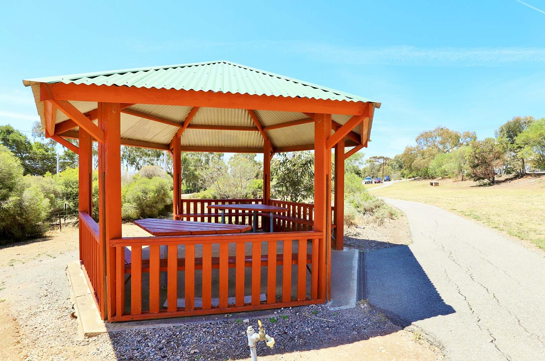 It has a small sheltered picnic table and drinking tap, with a bitumen path going through the length of the reserve. Take a moment and watch the electric trains zoom past.