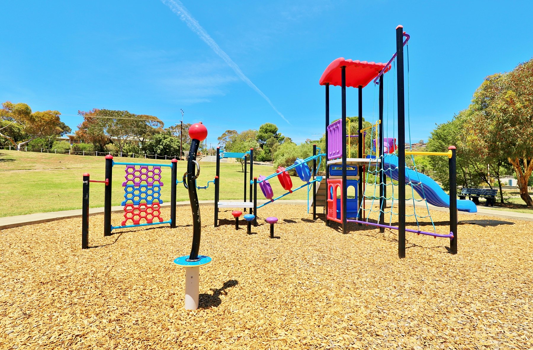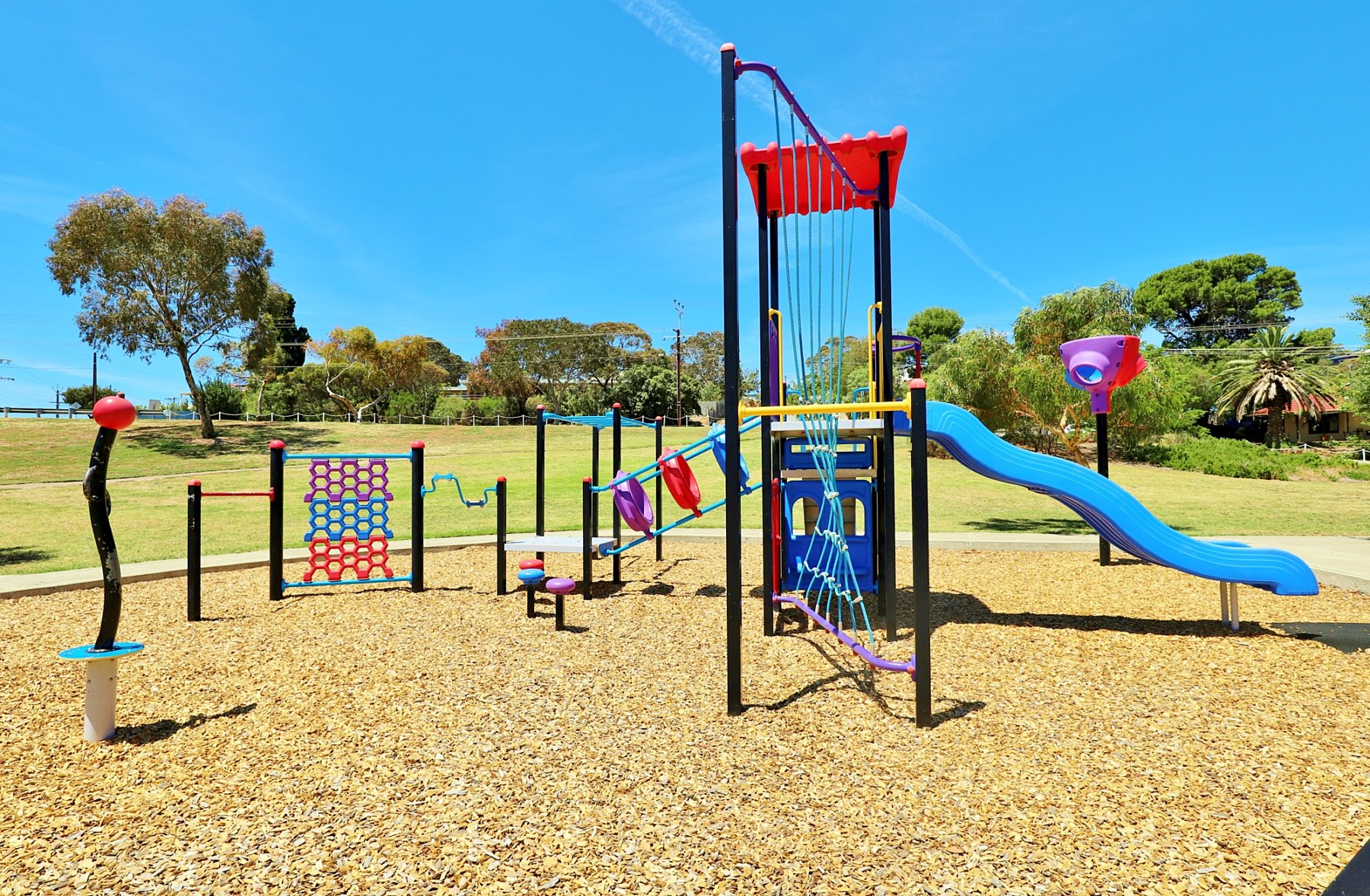 There is a large multistation with plenty of climbing challenges - a hexagonal net, tall twisted climbing net, hoop climb and monkey bars. A side-by-side double slide takes you back down so you can start the climb again.