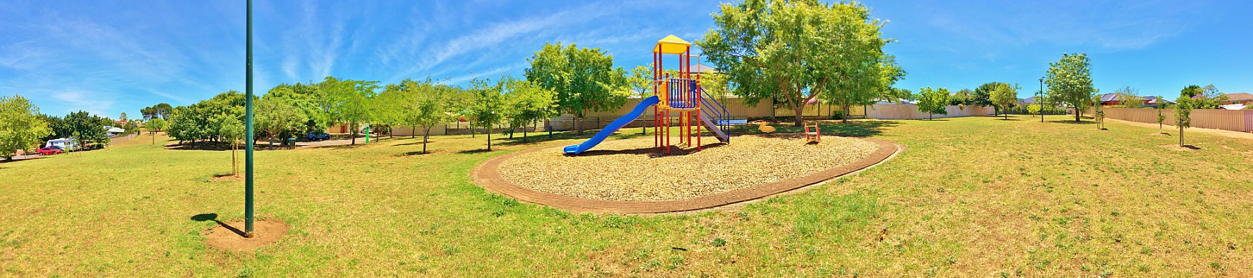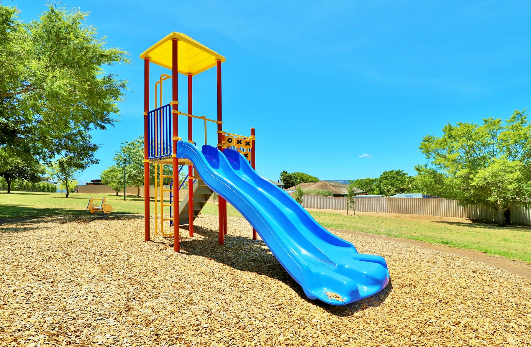 It's a small playground with a double slide, naughts and crosses panel and a two springers. It's nestled in between some cul-de-sacs and quiet streets, so although not fully fenced, it's a great spot for young children to explore.