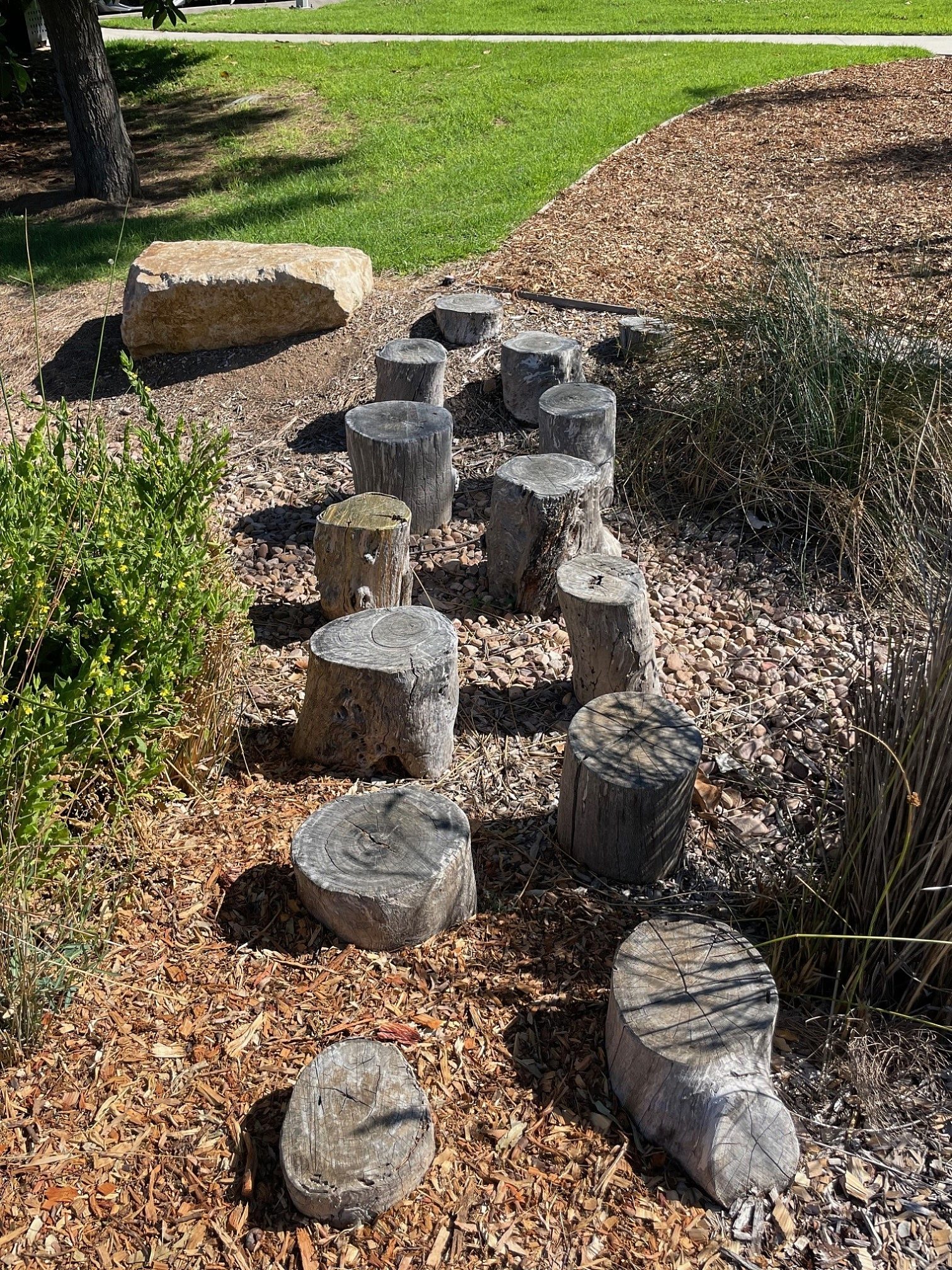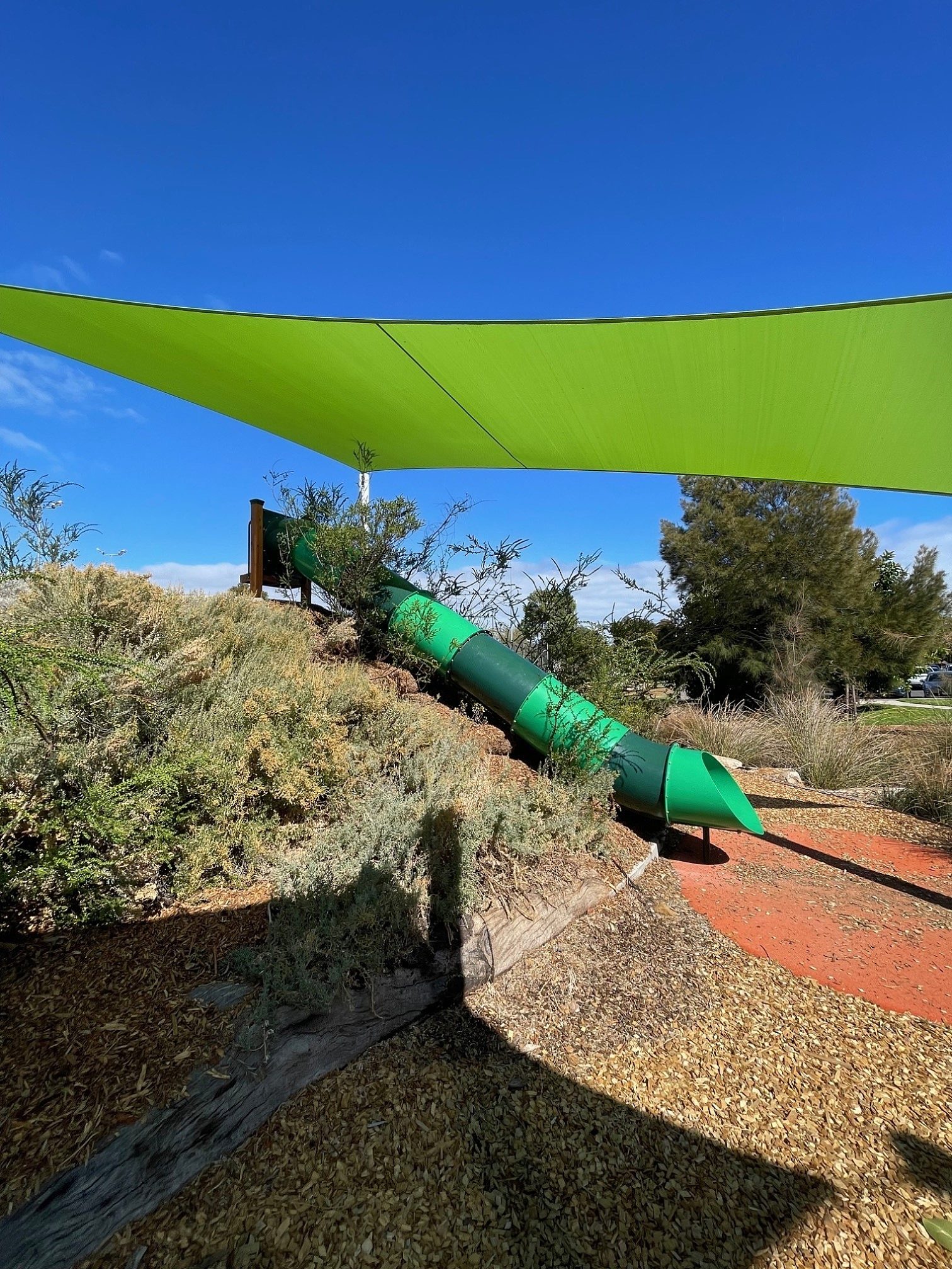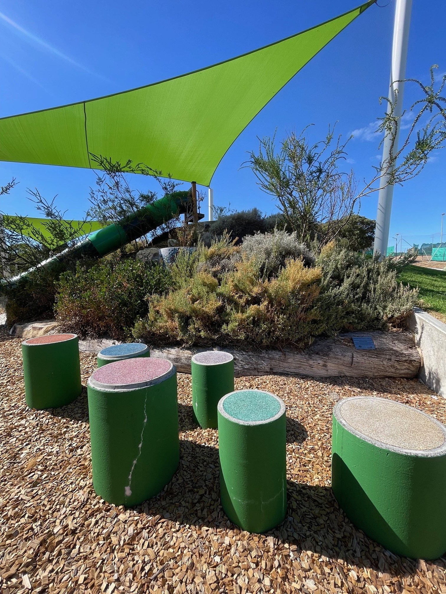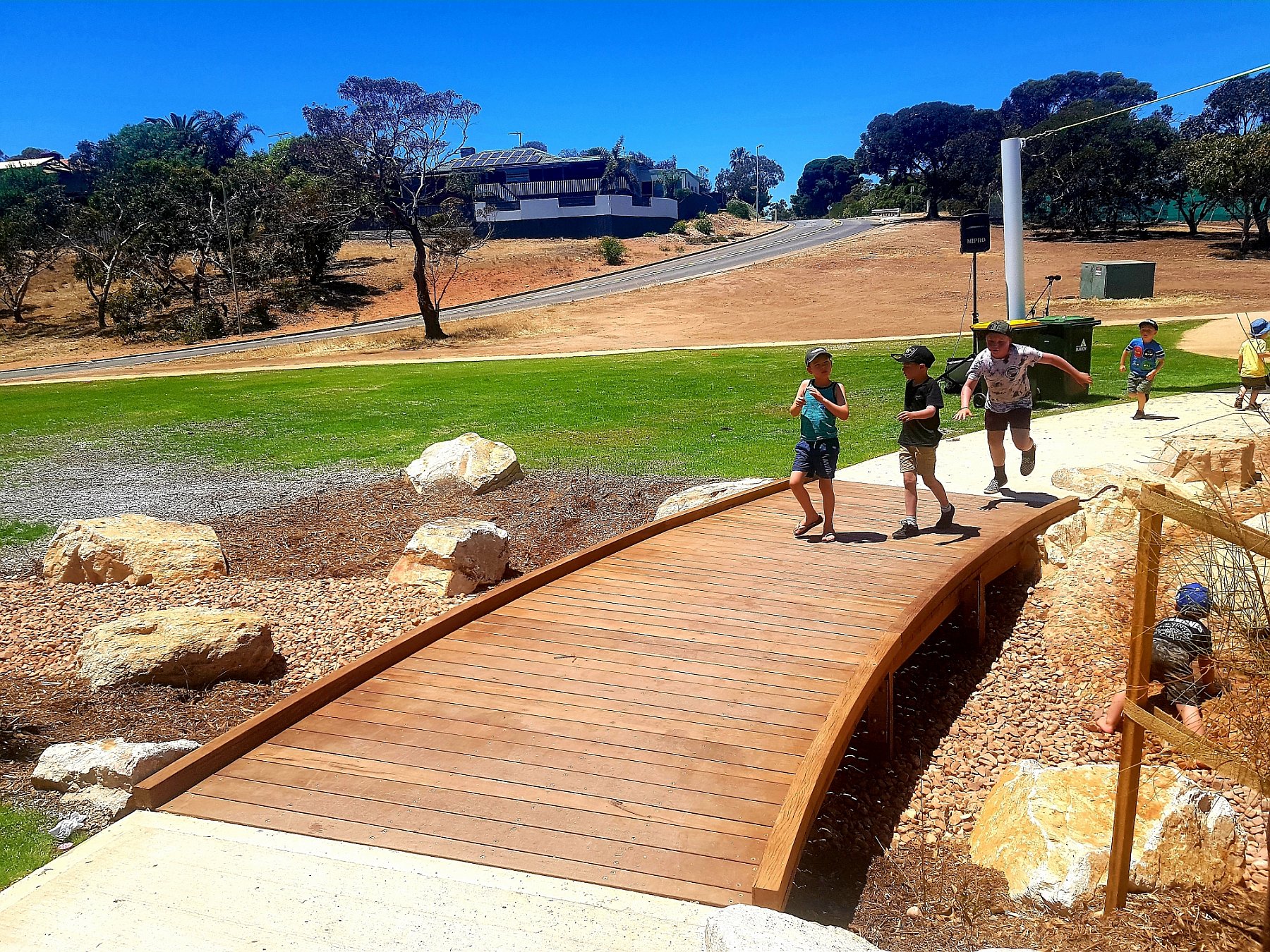 Older kids can test their balance on the stepping pipes and log crossings or get amongst the adventure as they explore the dry creek bed. There is a timber bridge over the rock-lined swale.