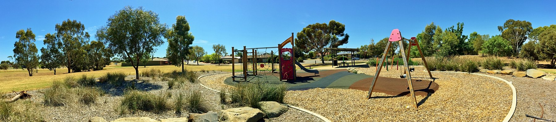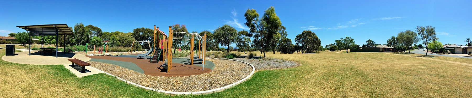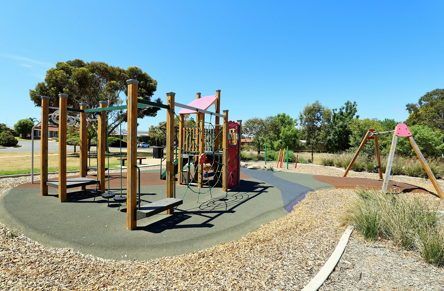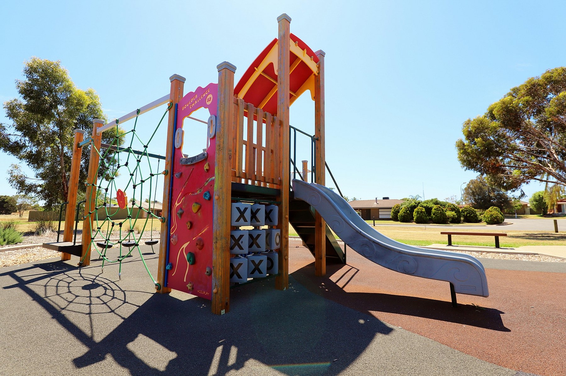It is a great park with a wooden multistation featuring circular monkey bars, pommel course, spider climbing net, rock climbing wall and slide. Beneath the multistation there is a bead panel and noughts and crosses.