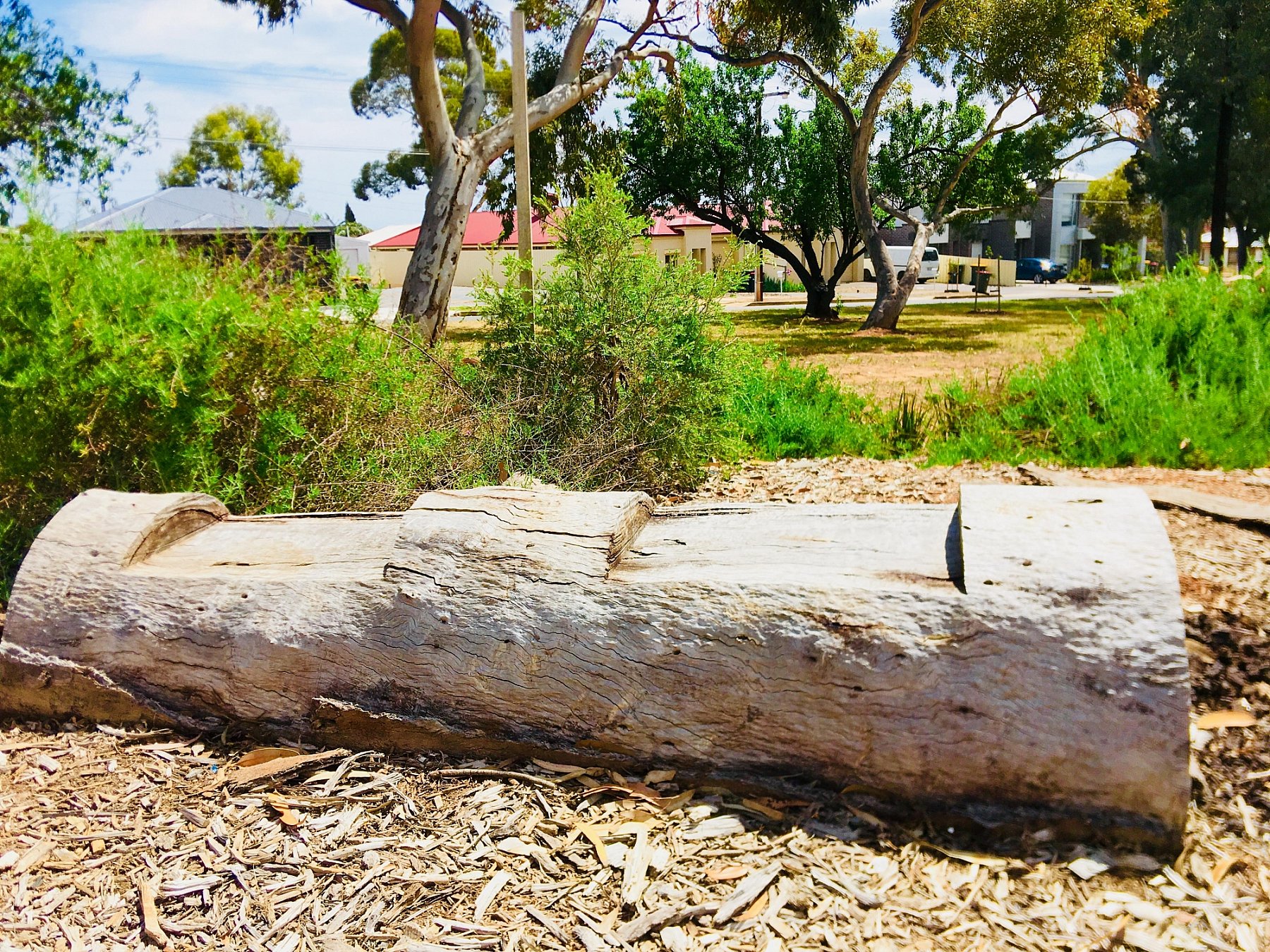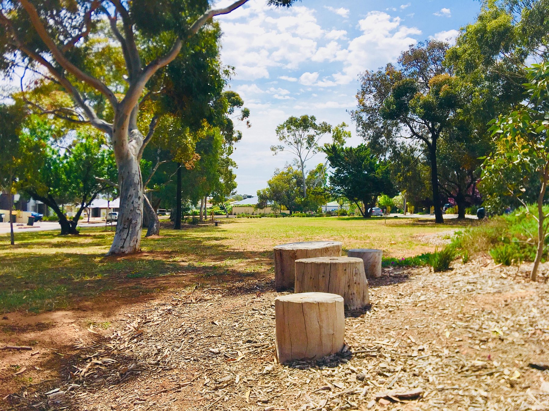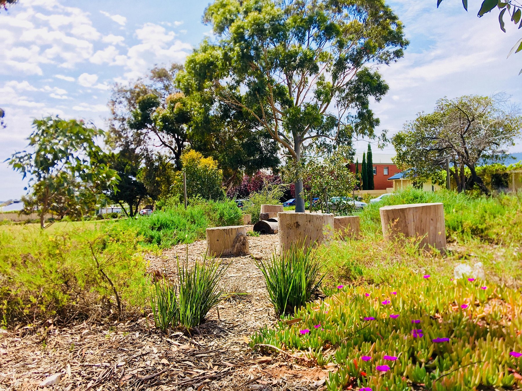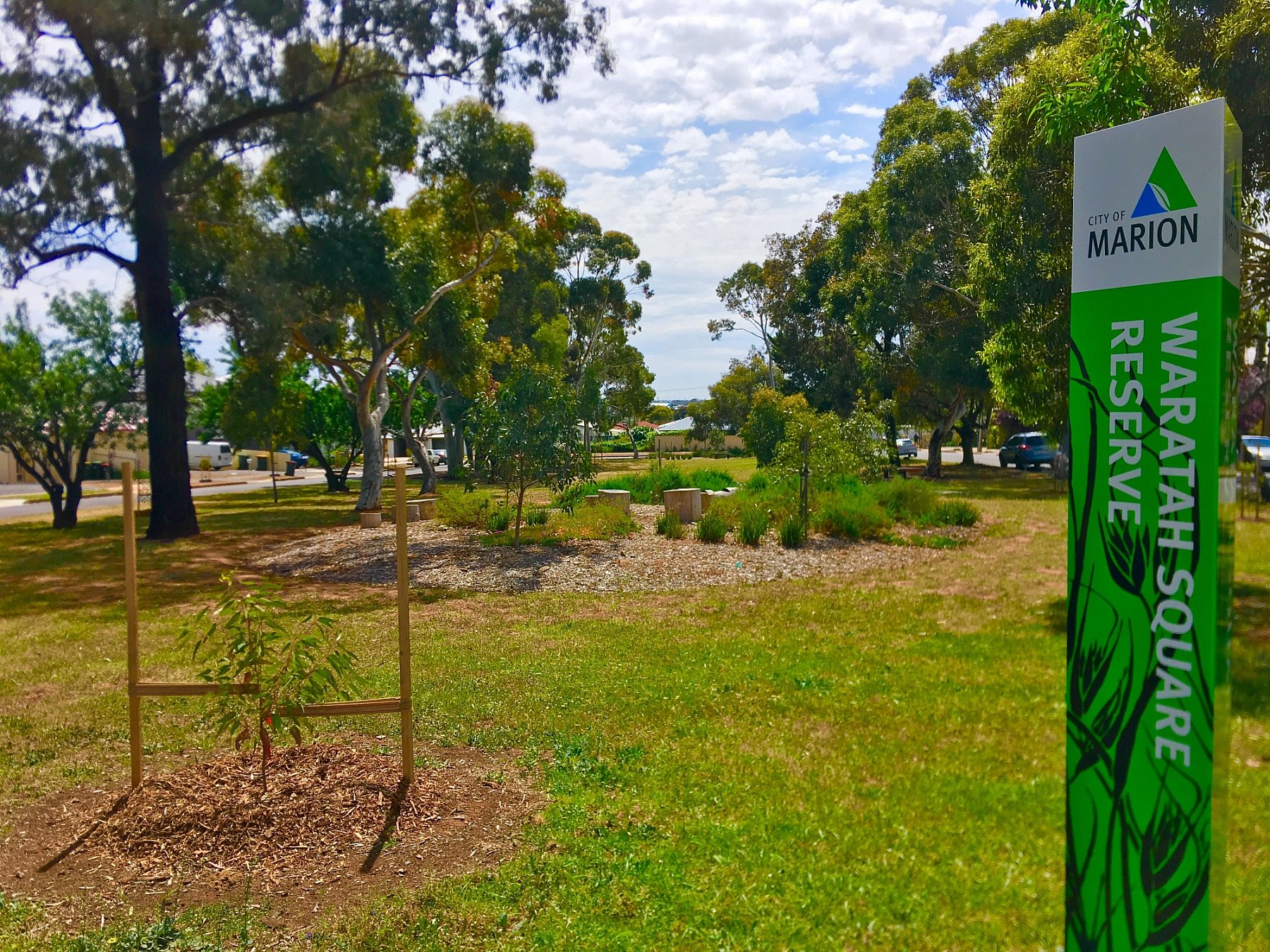Trees encircle the reserve, with a native garden bed at either end of the square. The native garden bed at the southern end of the reserve features natural seating, natural stepping logs and beams.