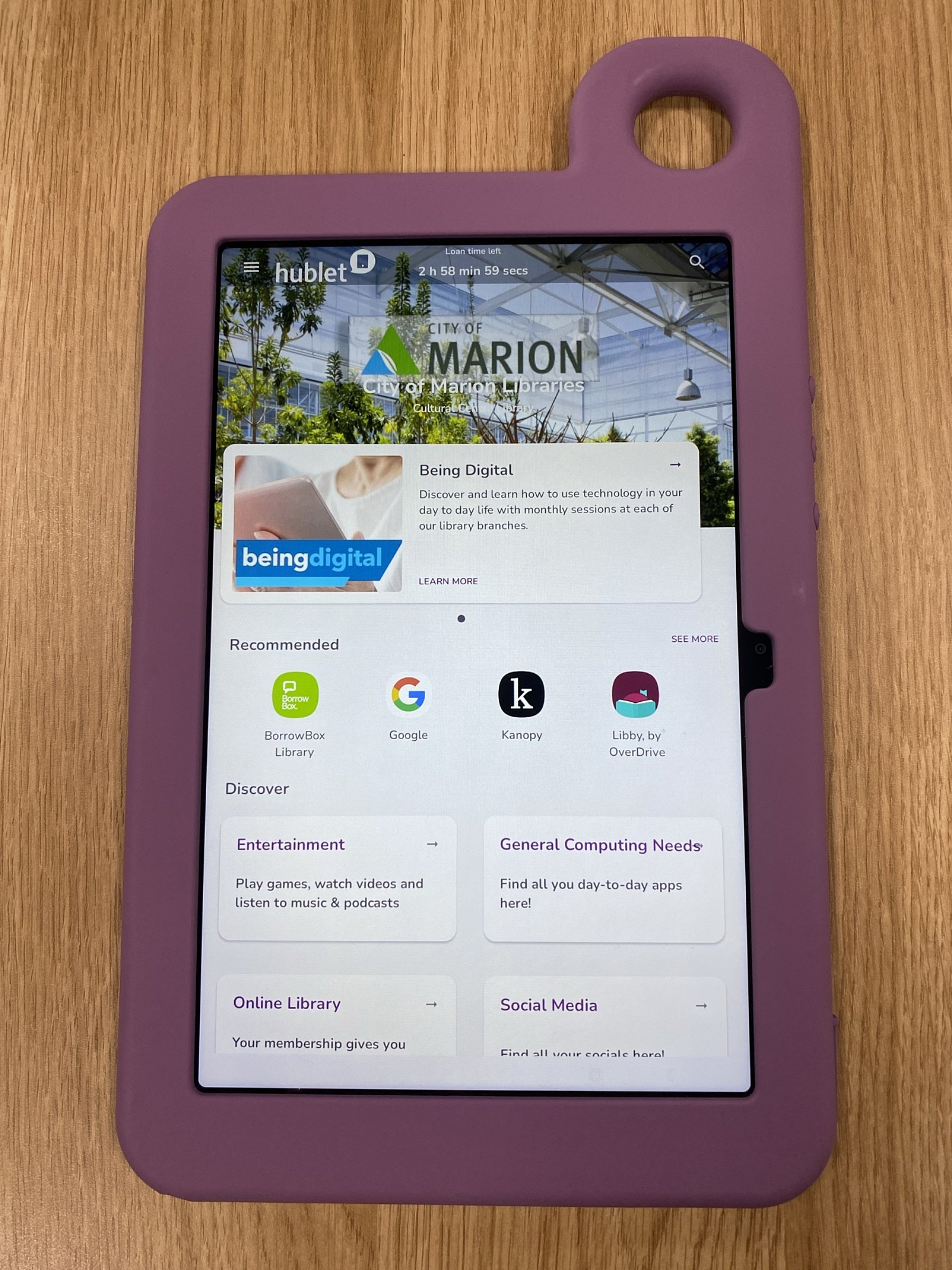 The Marion Cultural Centre Branch has a set of 6 loanable Android tablets, known as 'Hublets' available for customers to use within the Library.